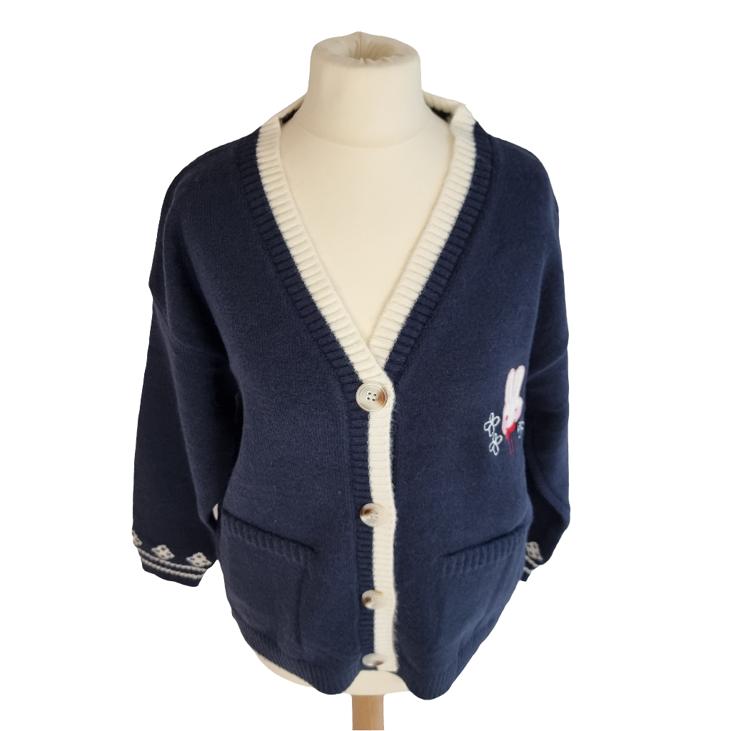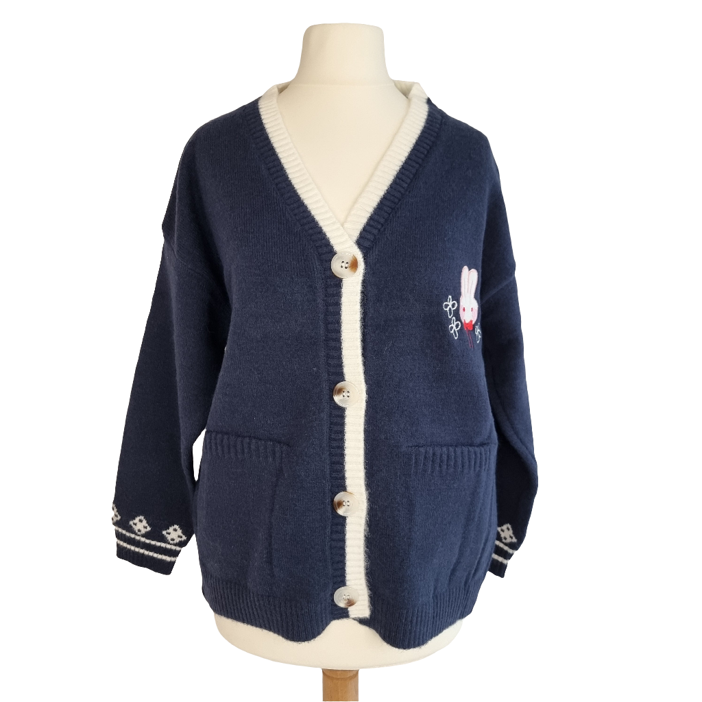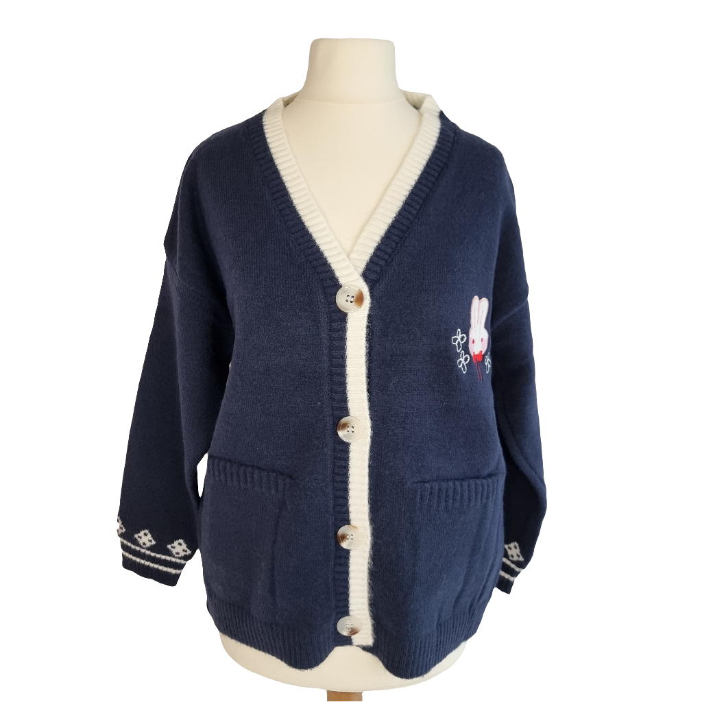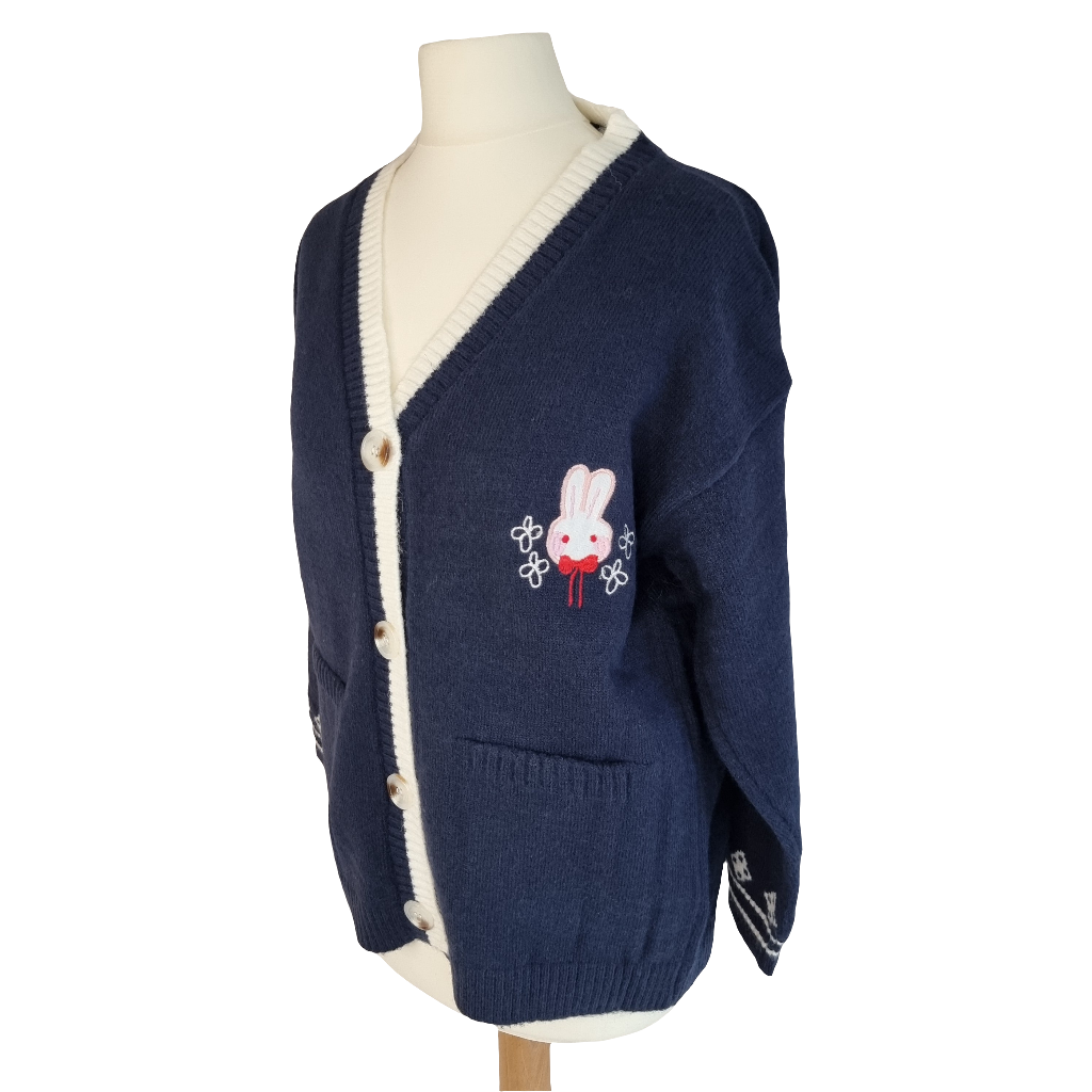 Embrace cuteness and warmth with the Bunny Blossom Cozy Cardigan. This charming navy blue cardigan features an adorable bunny applique with delicate floral embroidery, adding a playful touch to your outfit. The soft, knitted fabric and button-down design make it easy to layer over any look. With contrasting white trim and cozy pockets, this cardigan is perfect for casual outings or lounging in style. Stay cozy, cute, and chic all season long with this delightful piece!