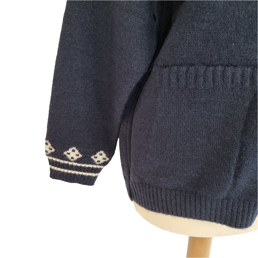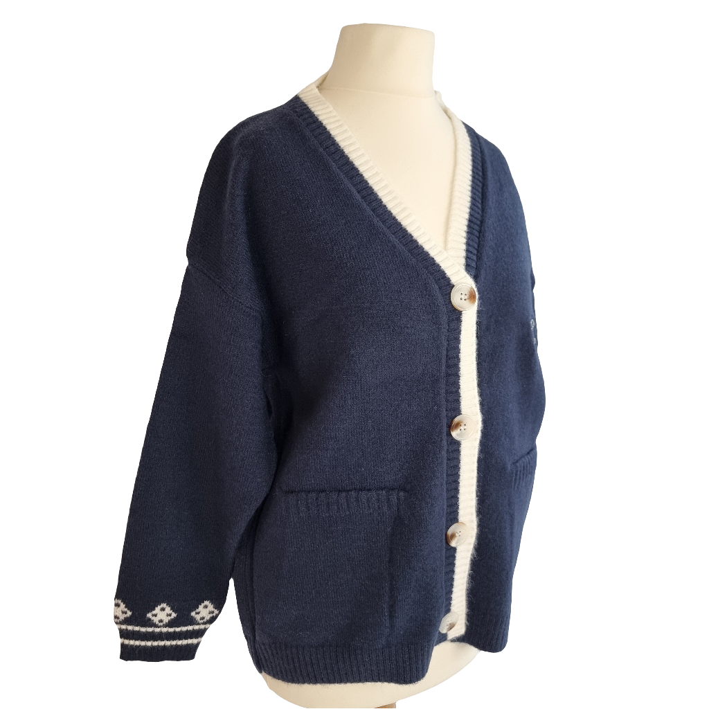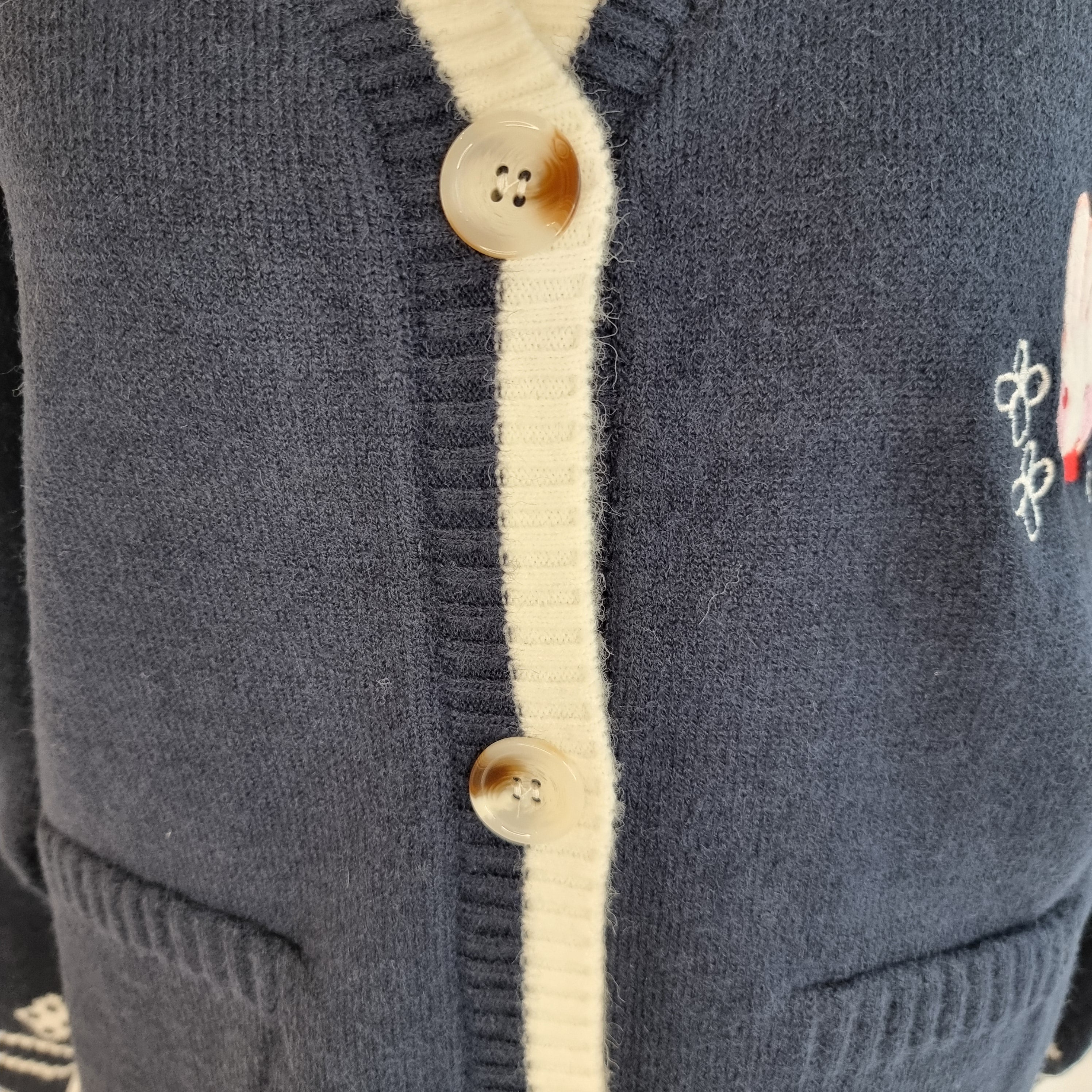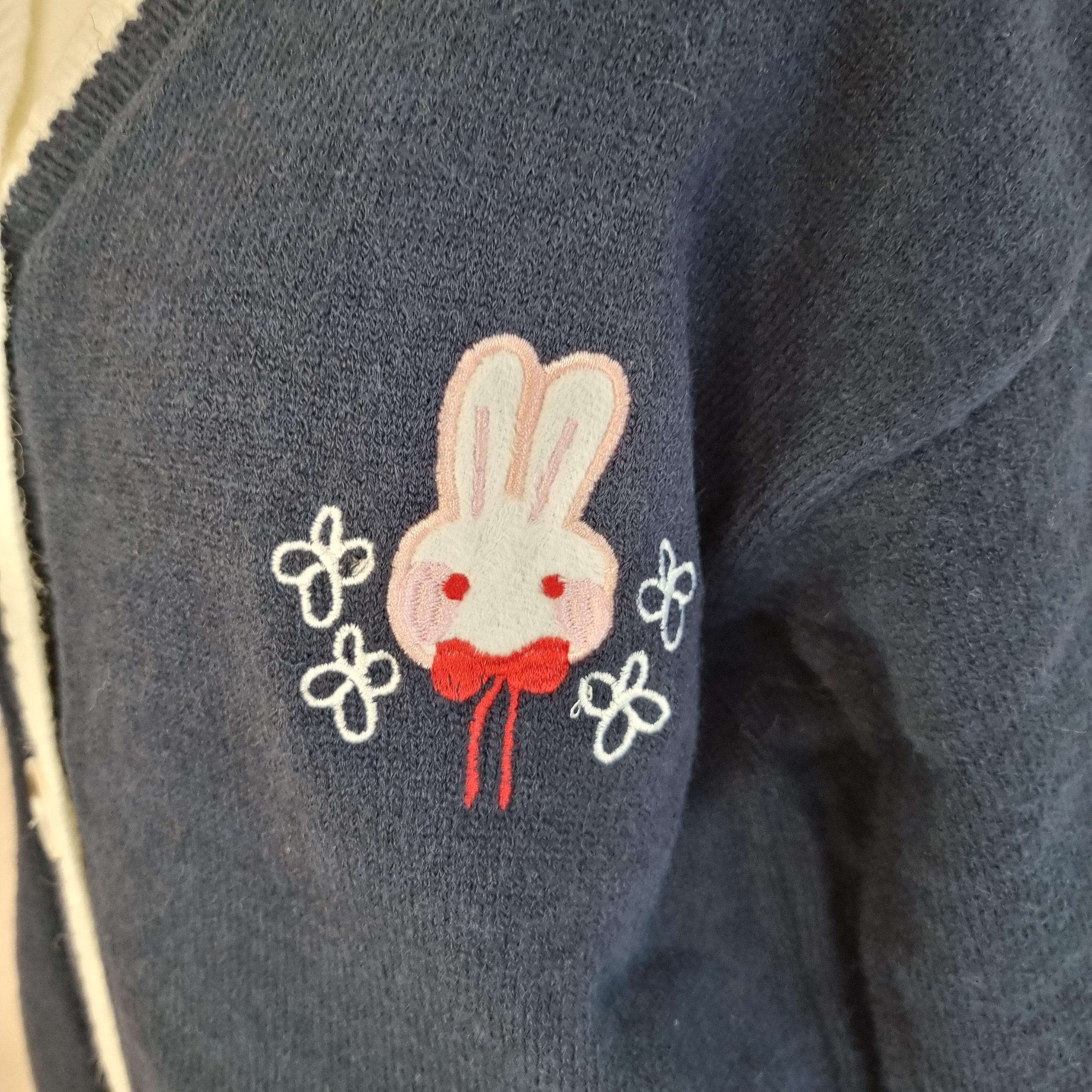 Embrace cuteness and warmth with the Bunny Blossom Cozy Cardigan. This charming navy blue cardigan features an adorable bunny applique with delicate floral embroidery, adding a playful touch to your outfit. The soft, knitted fabric and button-down design make it easy to layer over any look. With contrasting white trim and cozy pockets, this cardigan is perfect for casual outings or lounging in style. Stay cozy, cute, and chic all season long with this delightful piece!
