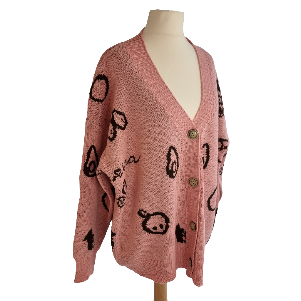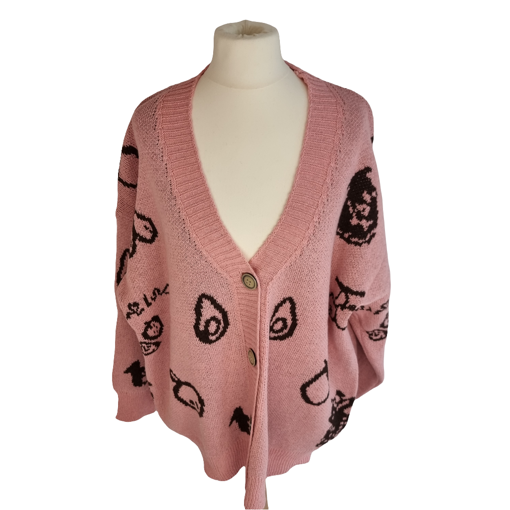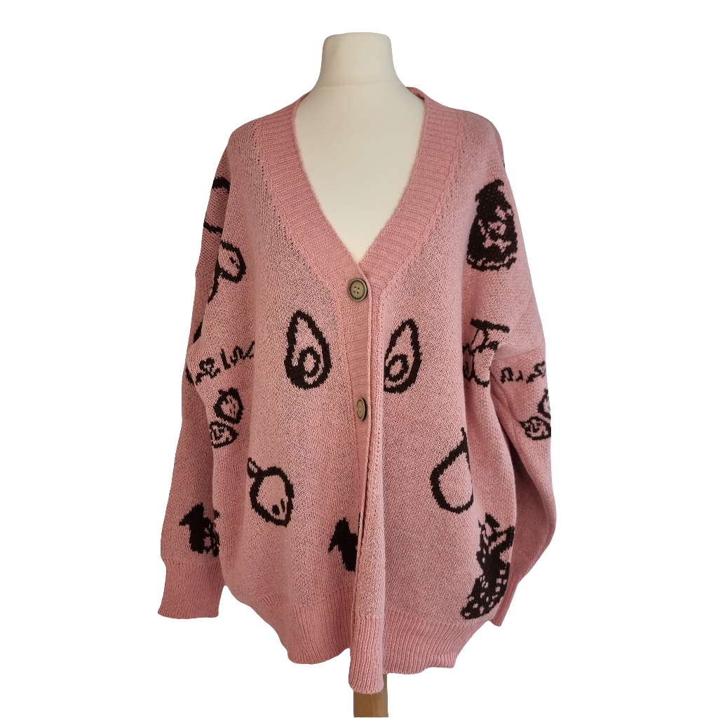 Add a touch of whimsy to your wardrobe with this Cozy Charm Cardigan. Designed in a delightful pink hue with playful black motifs, this oversized cardigan brings comfort and style together effortlessly. Featuring a relaxed, loose fit with drop shoulders and wooden button closures, it’s perfect for layering over your favorite outfits. Whether you’re lounging at home or stepping out, this cardigan offers warmth with a dose of cute and quirky flair. Embrace the playful side of fashion with a piece that’s as cozy as it is charming.