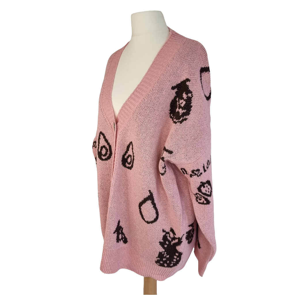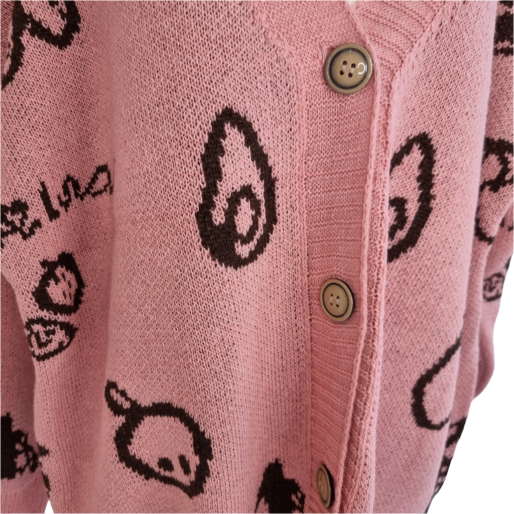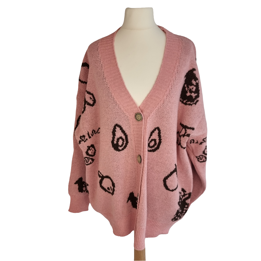 Add a touch of whimsy to your wardrobe with this Cozy Charm Cardigan. Designed in a delightful pink hue with playful black motifs, this oversized cardigan brings comfort and style together effortlessly. Featuring a relaxed, loose fit with drop shoulders and wooden button closures, it’s perfect for layering over your favorite outfits. Whether you’re lounging at home or stepping out, this cardigan offers warmth with a dose of cute and quirky flair. Embrace the playful side of fashion with a piece that’s as cozy as it is charming.