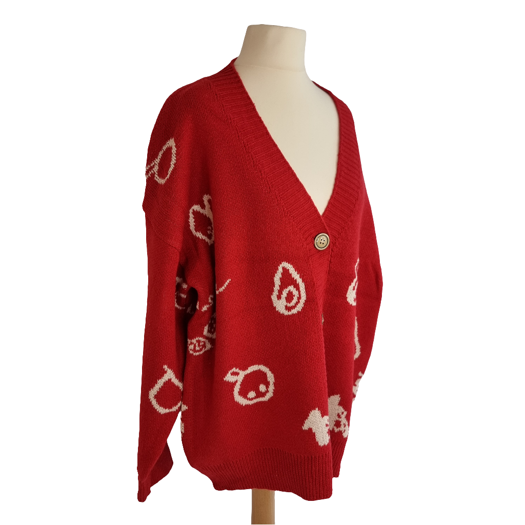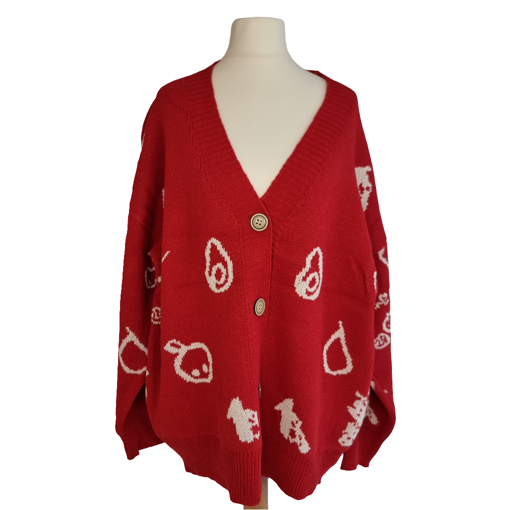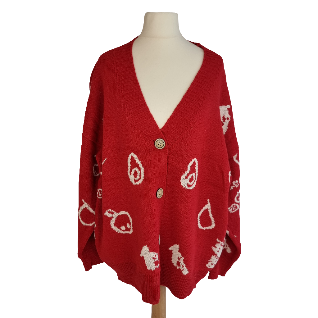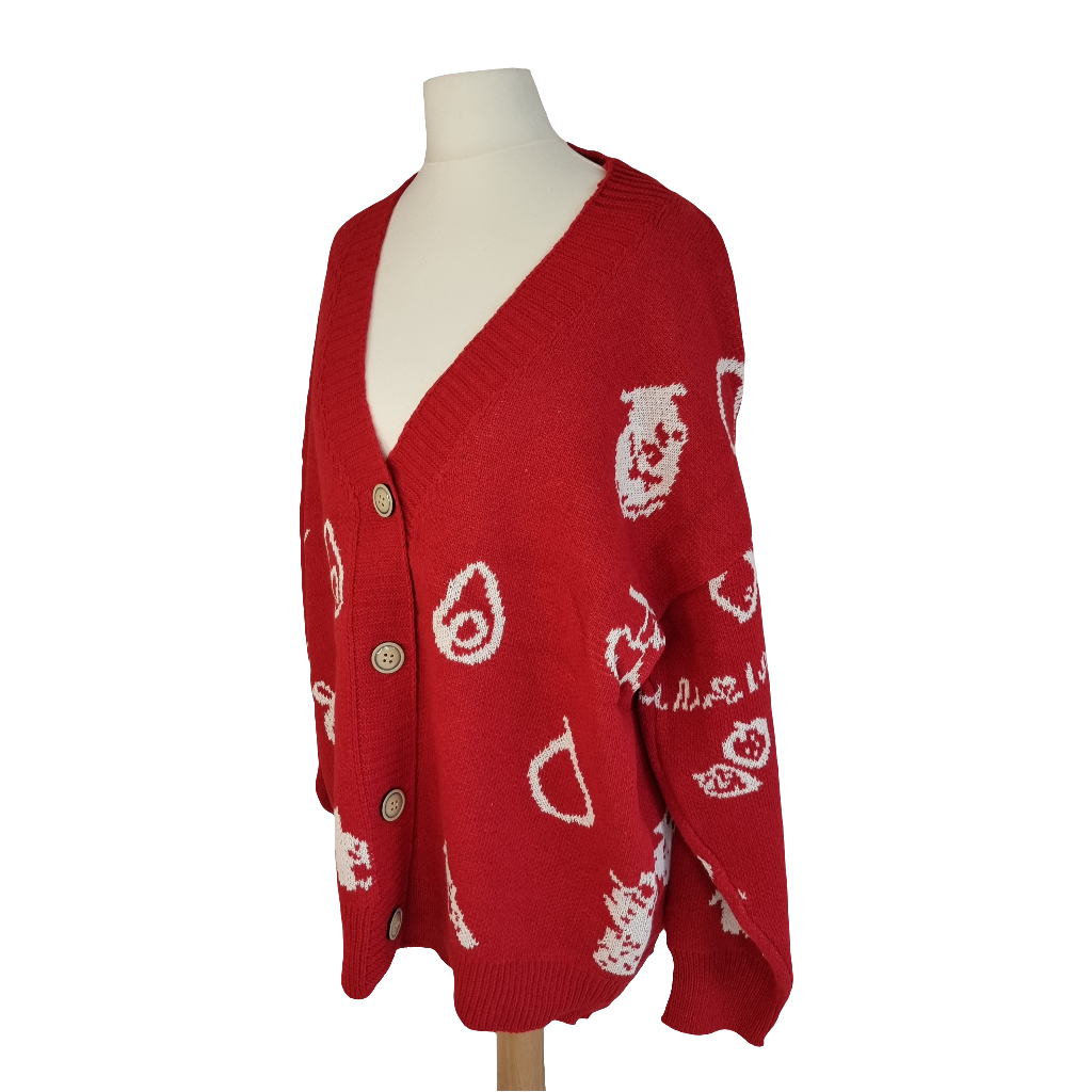 Wrap yourself in the warmth and style of our Cozy Red Fruits Knit Cardigan. This oversized cardigan features playful white graphics and a relaxed, slouchy fit perfect for layering. The vibrant red base is adorned with charming, abstract icons, adding a touch of whimsy to your outfit. Crafted from soft, high-quality knit fabric, it offers a cozy feel, while the button-down front and deep V-neckline make it easy to style over your favorite tees or turtlenecks. Ideal for casual days or cozy nights, this cardigan is a statement piece that blends comfort with a unique, artistic flair.