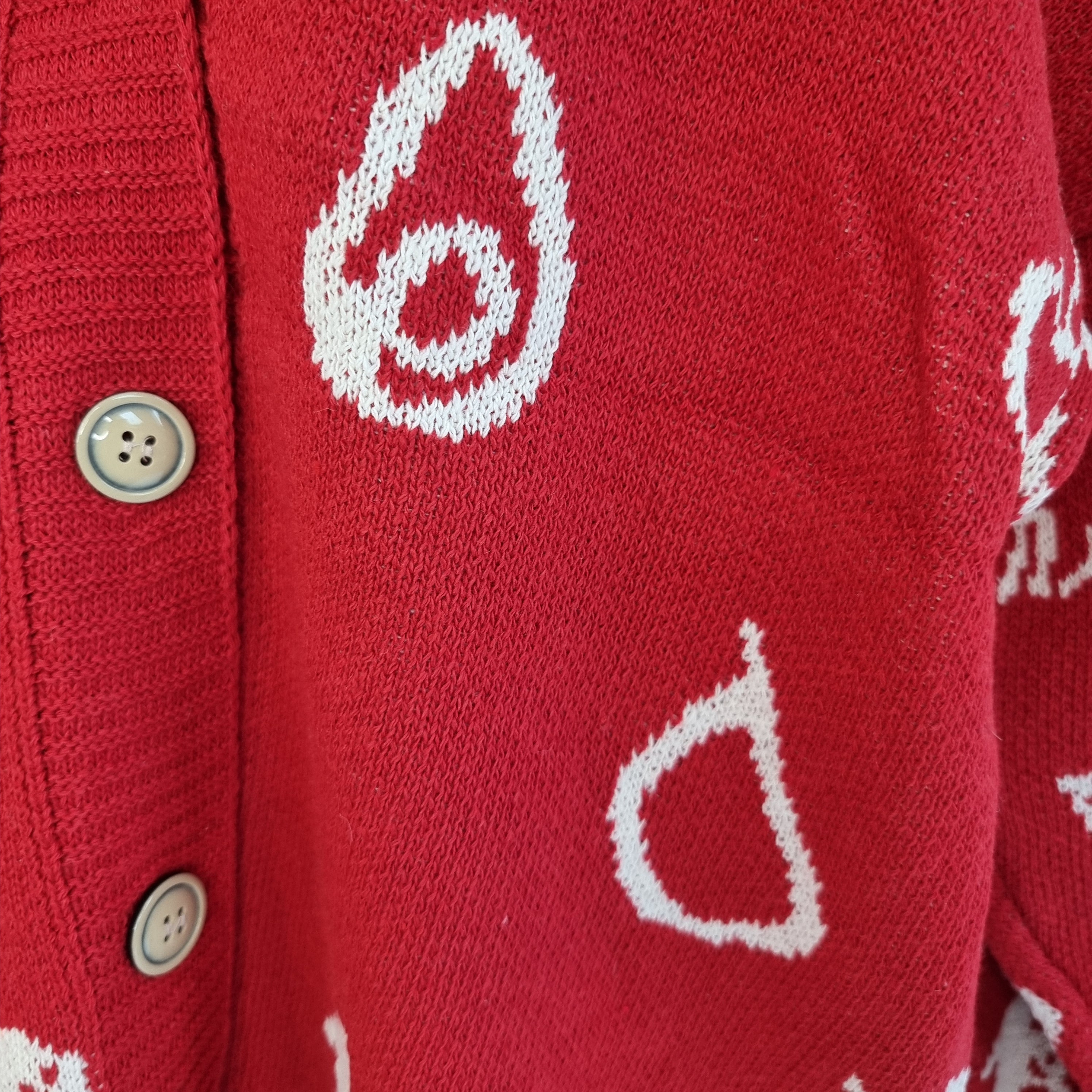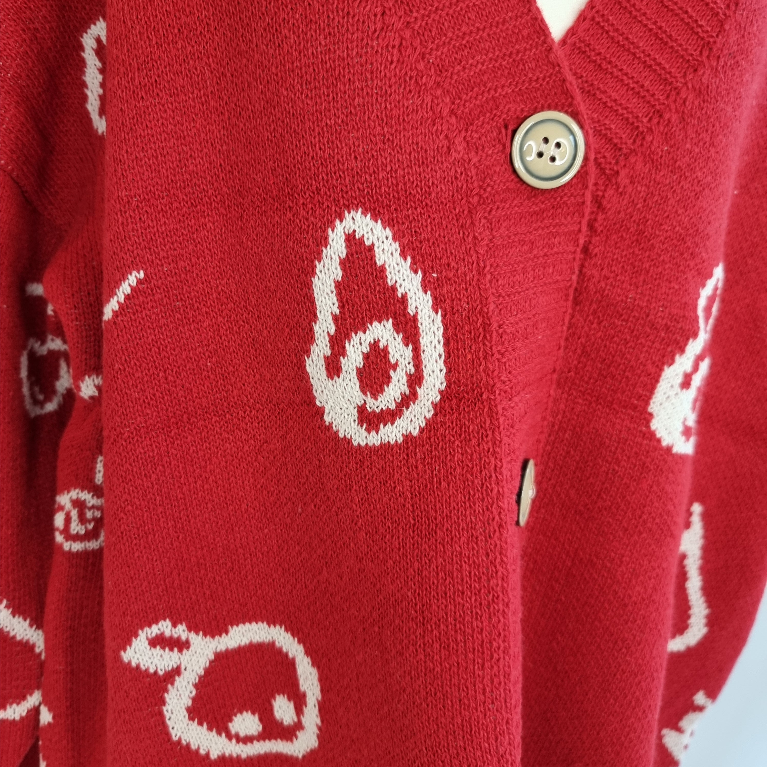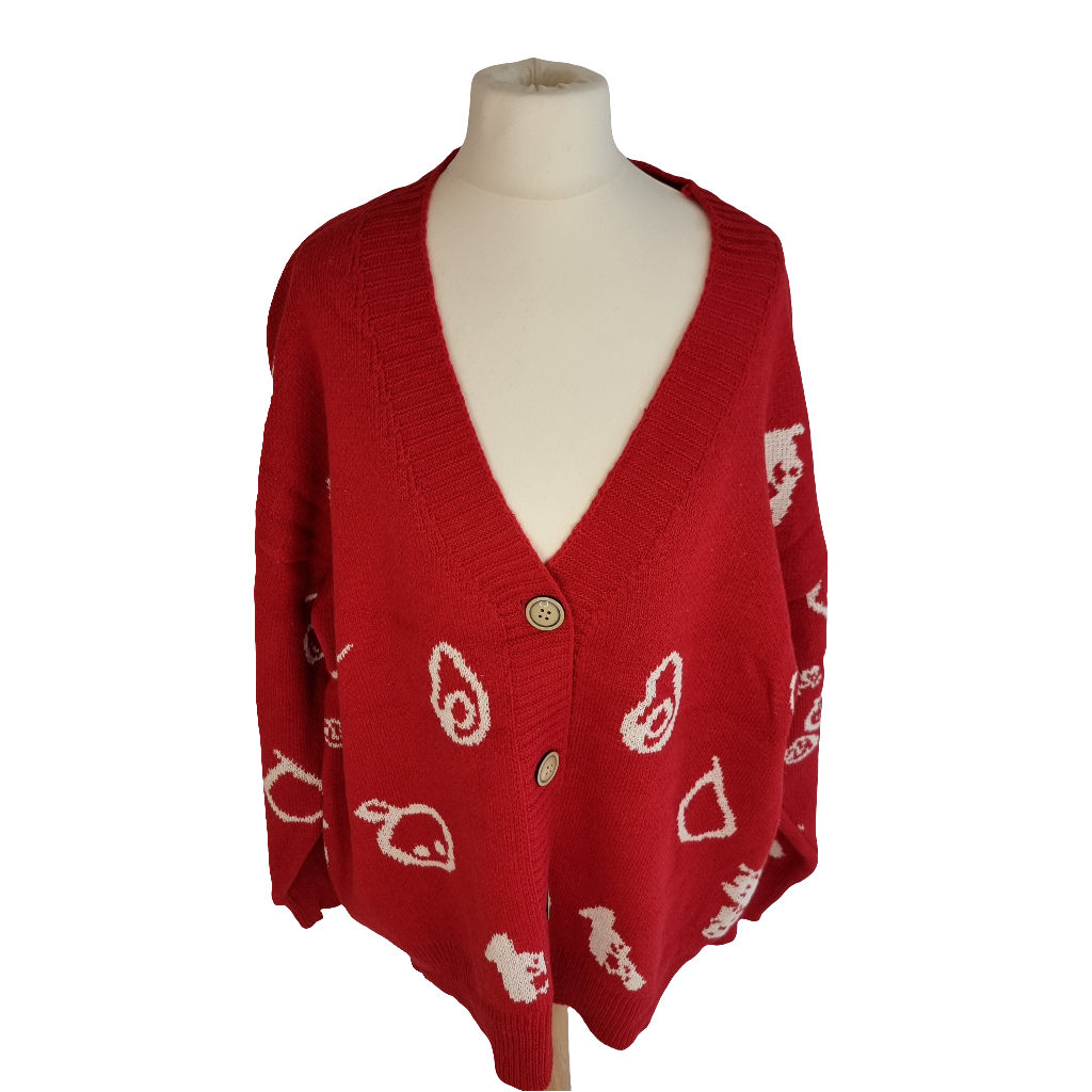 Wrap yourself in the warmth and style of our Cozy Red Fruits Knit Cardigan. This oversized cardigan features playful white graphics and a relaxed, slouchy fit perfect for layering. The vibrant red base is adorned with charming, abstract icons, adding a touch of whimsy to your outfit. Crafted from soft, high-quality knit fabric, it offers a cozy feel, while the button-down front and deep V-neckline make it easy to style over your favorite tees or turtlenecks. Ideal for casual days or cozy nights, this cardigan is a statement piece that blends comfort with a unique, artistic flair.