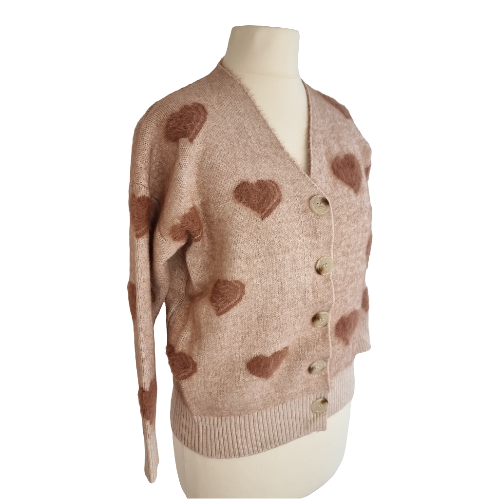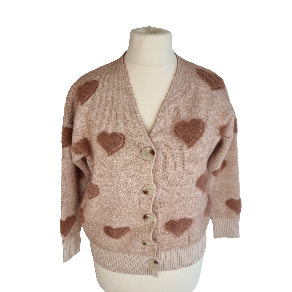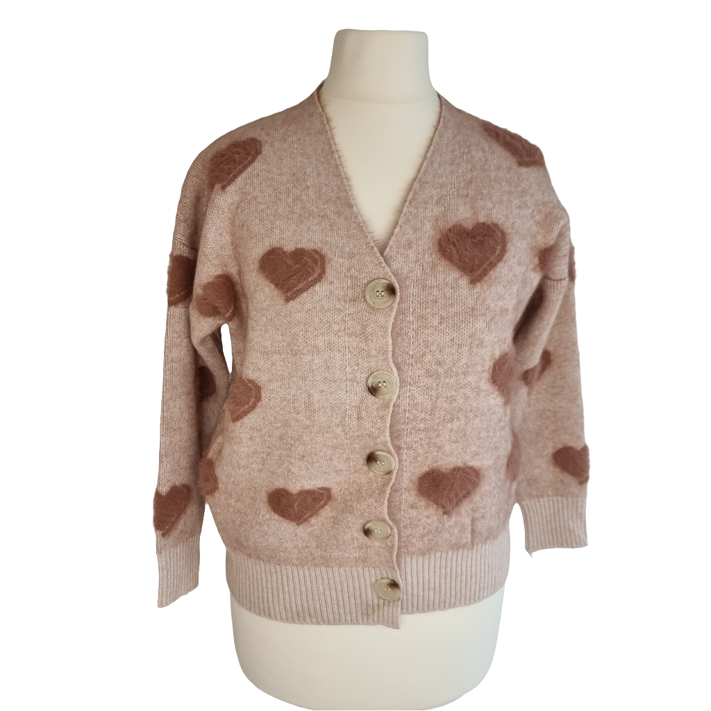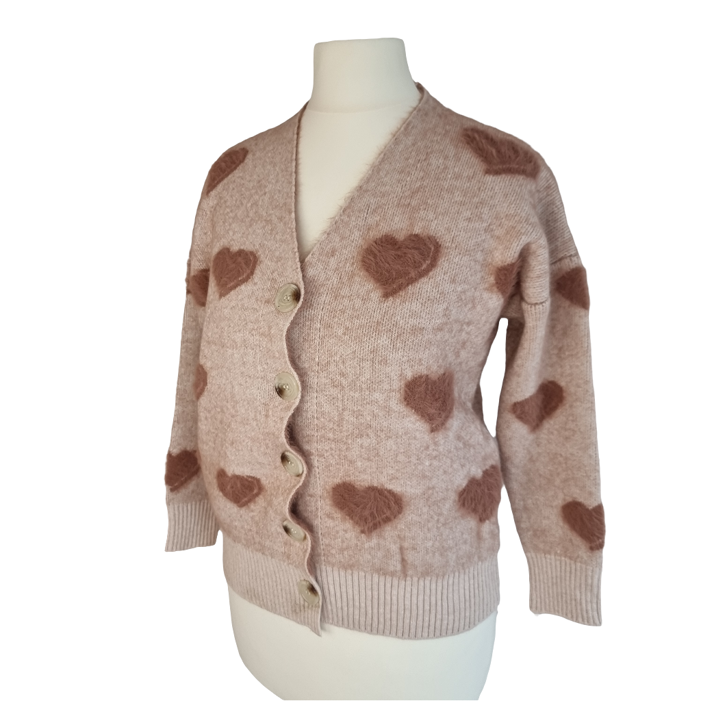 Wrap yourself in warmth and charm with our Fuzzy Heart Cozy Cardigan. This soft knit cardigan, in a delicate beige shade, is adorned with adorable plush heart patches that add a playful, feminine touch. Perfect for a cozy day at home or a casual outing, this cardigan combines comfort with a hint of romance. Its relaxed fit and easy button-down style make it an effortless layer over your favorite top. Embrace a sweet, stylish look and let this cardigan bring a touch of warmth to your wardrobe!