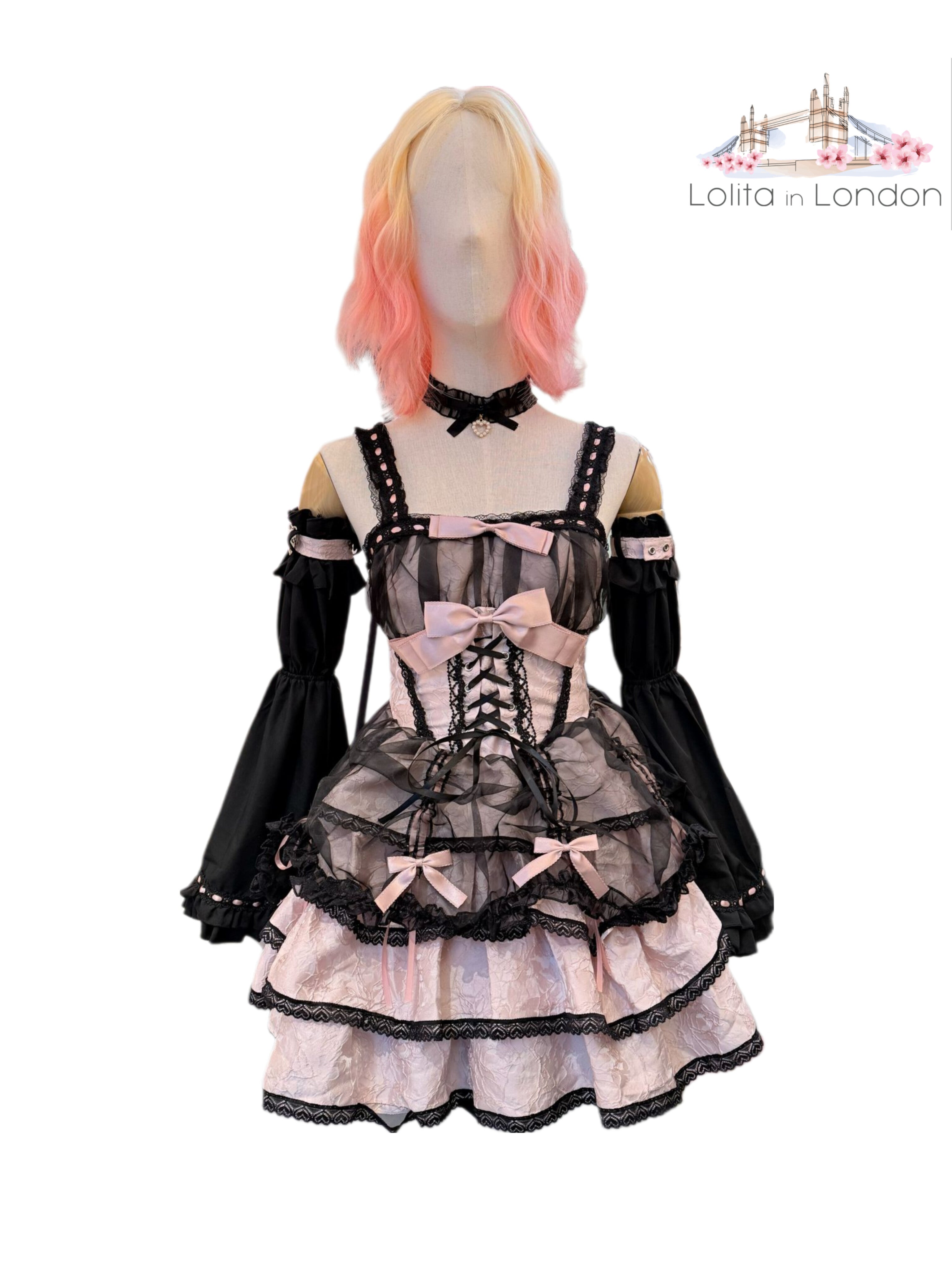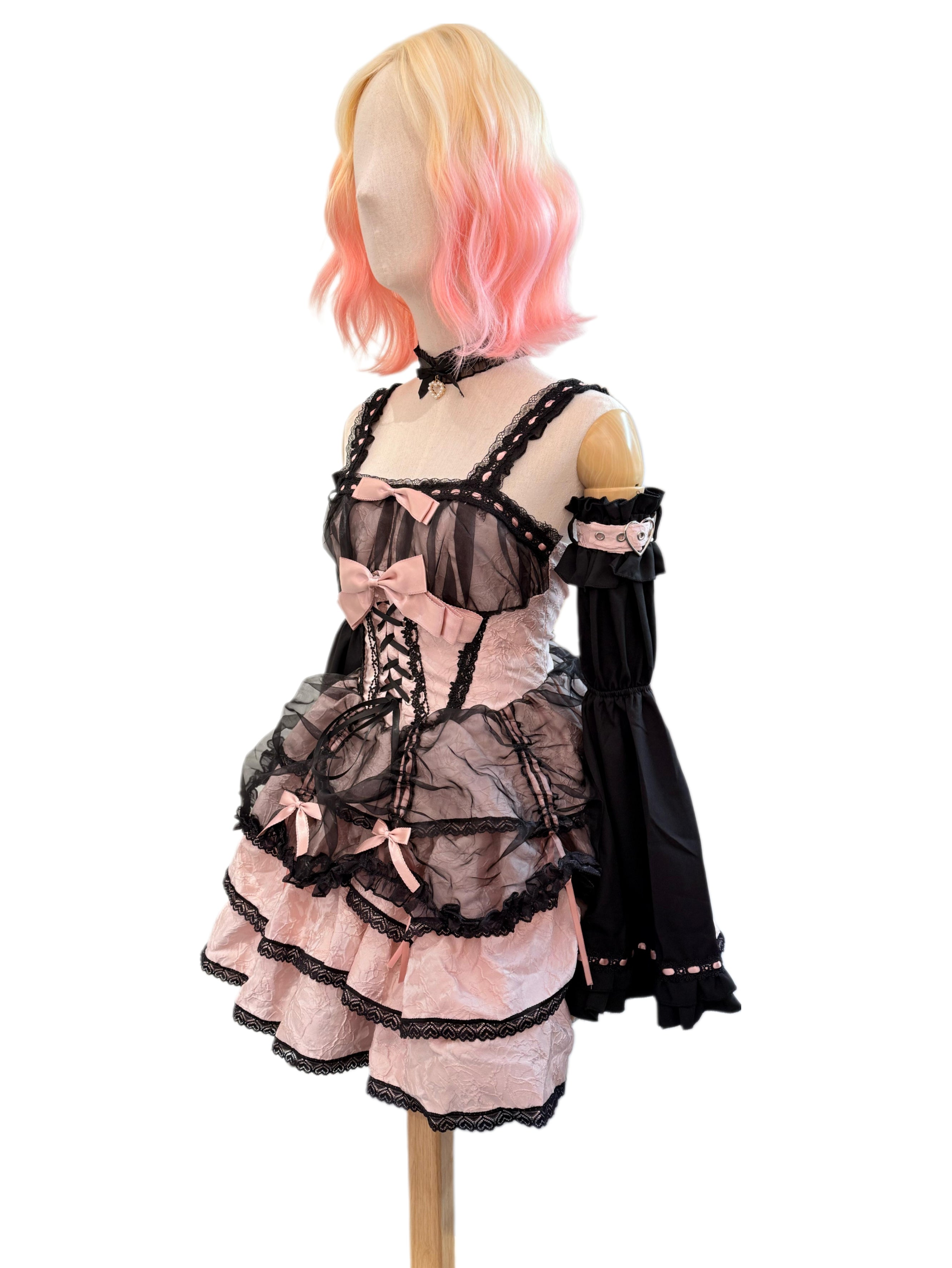 Step into the enchanting world of Gothic Lolita fashion with this elegant and dreamy dress, perfect for those who love a blend of sweet and dark aesthetics. Featuring a stunning combination of black sheer fabric and soft pastel pink lace, this dress is designed to make you feel like a true doll.