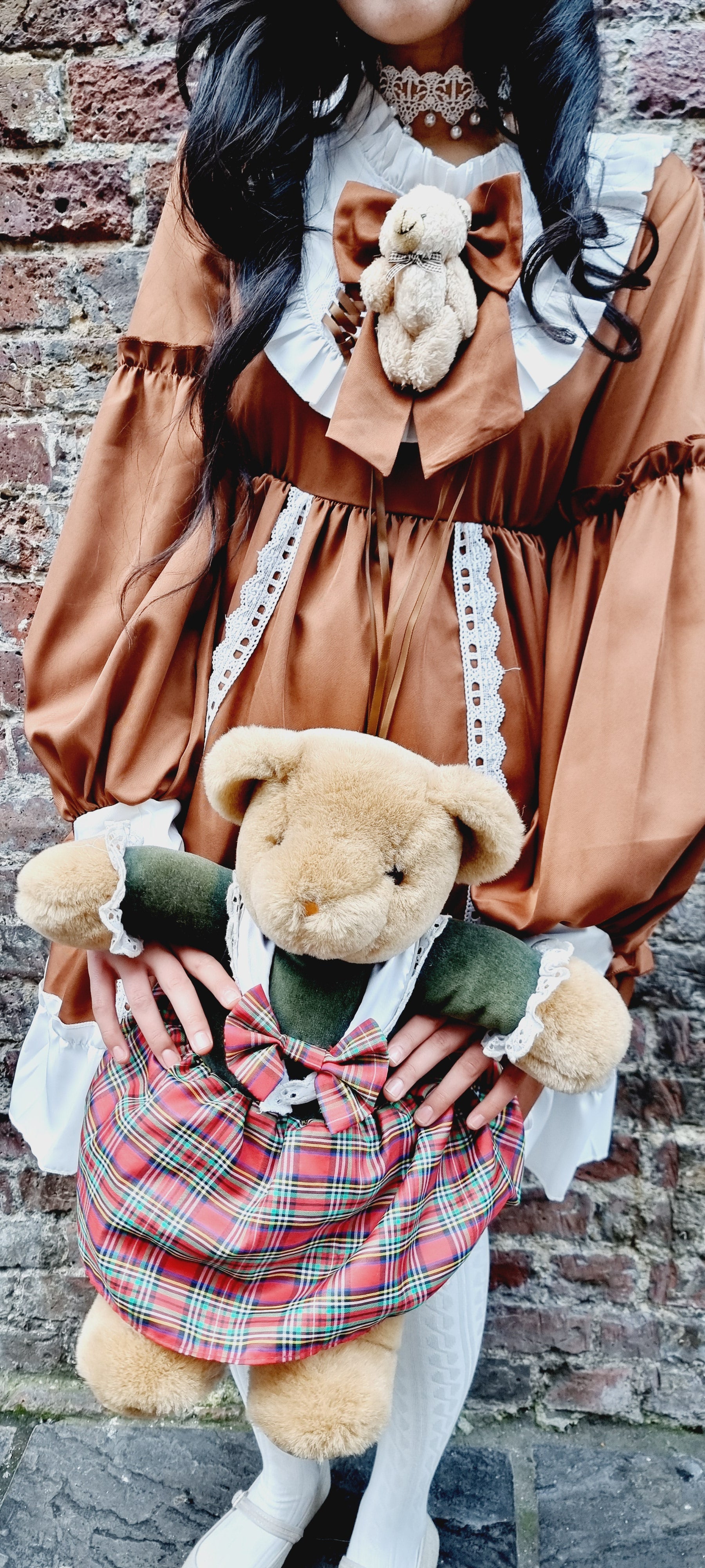 Embrace timeless elegance with our beautiful Brown Long-Sleeve Lolita Dress. This enchanting design features delicate lace details and frilled trims, adding a touch of classic charm to your wardrobe. The soft brown hue is perfectly complemented by cream accents, creating a warm and cozy look. A cute bear accessory at the chest gives a playful and whimsical touch, while the full-length ruffled skirt adds a sense of sophistication and drama.