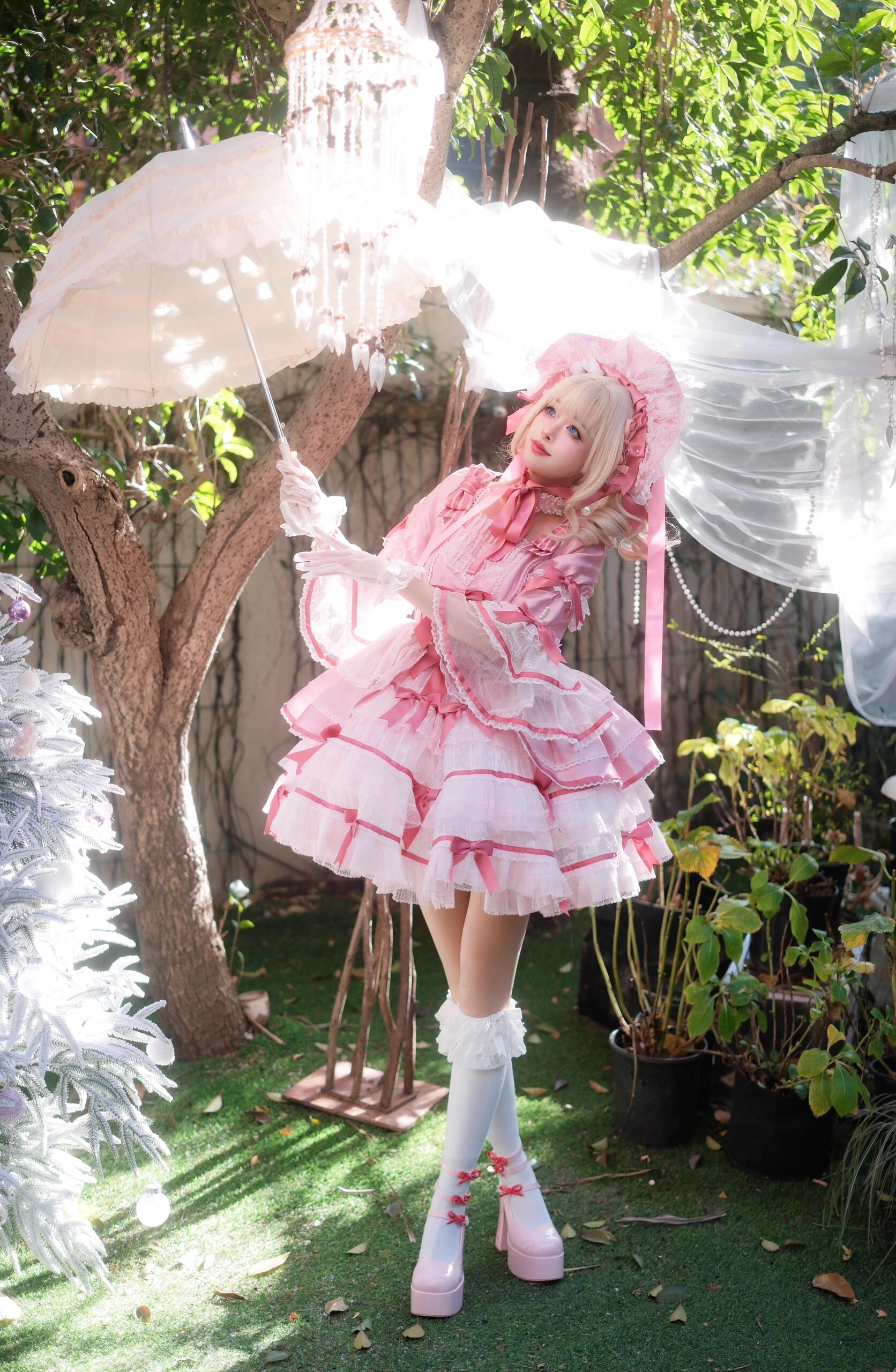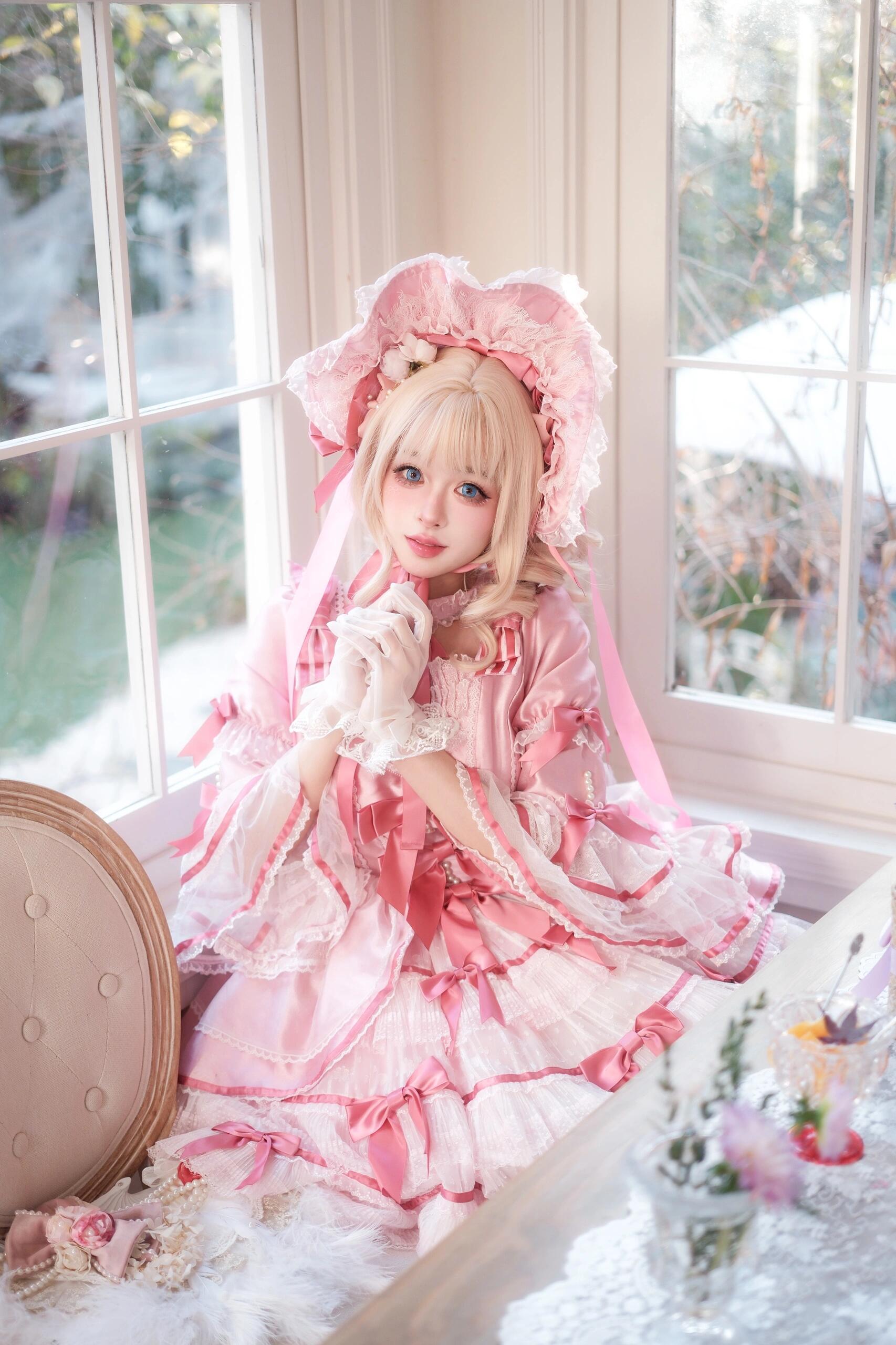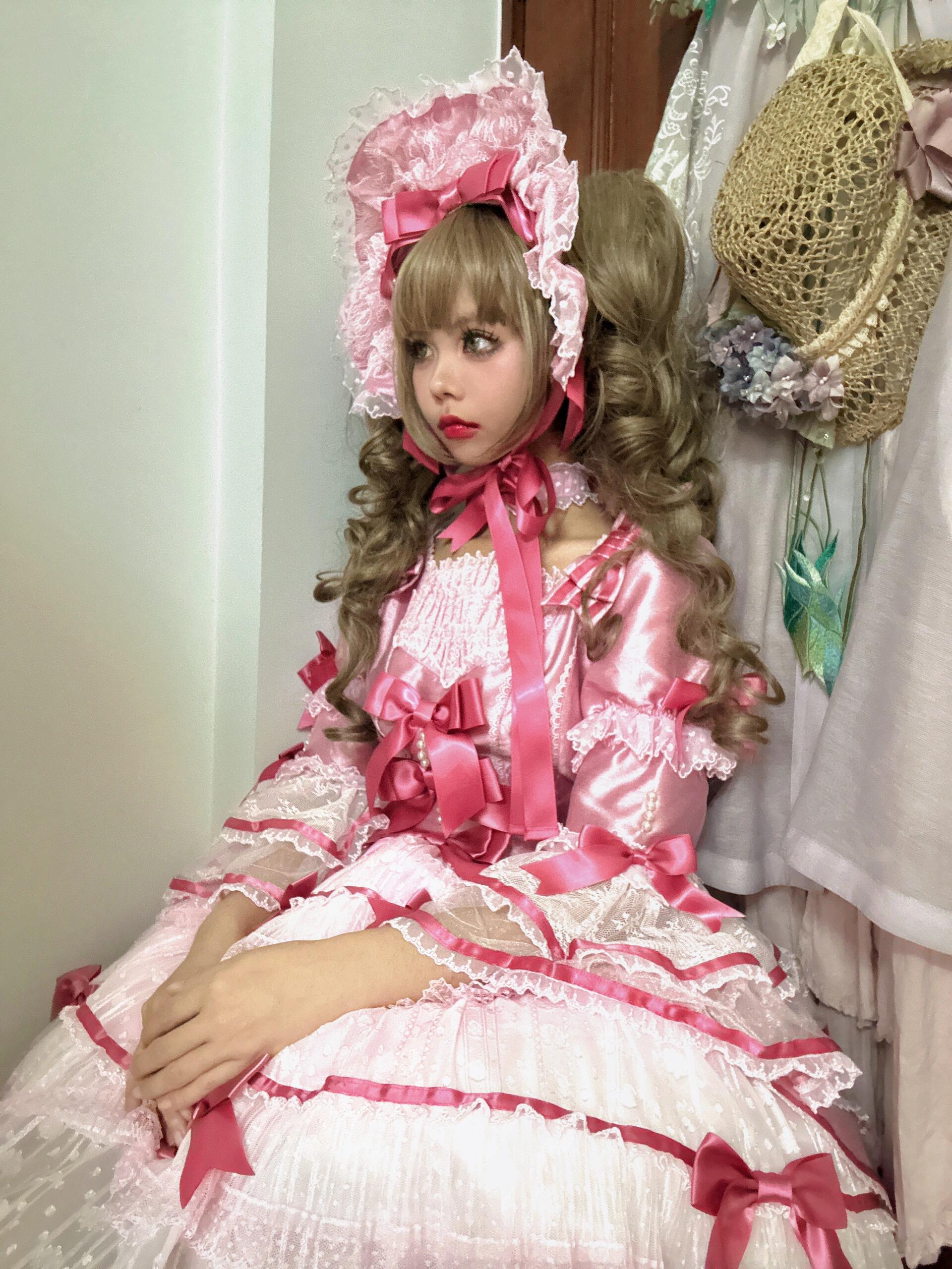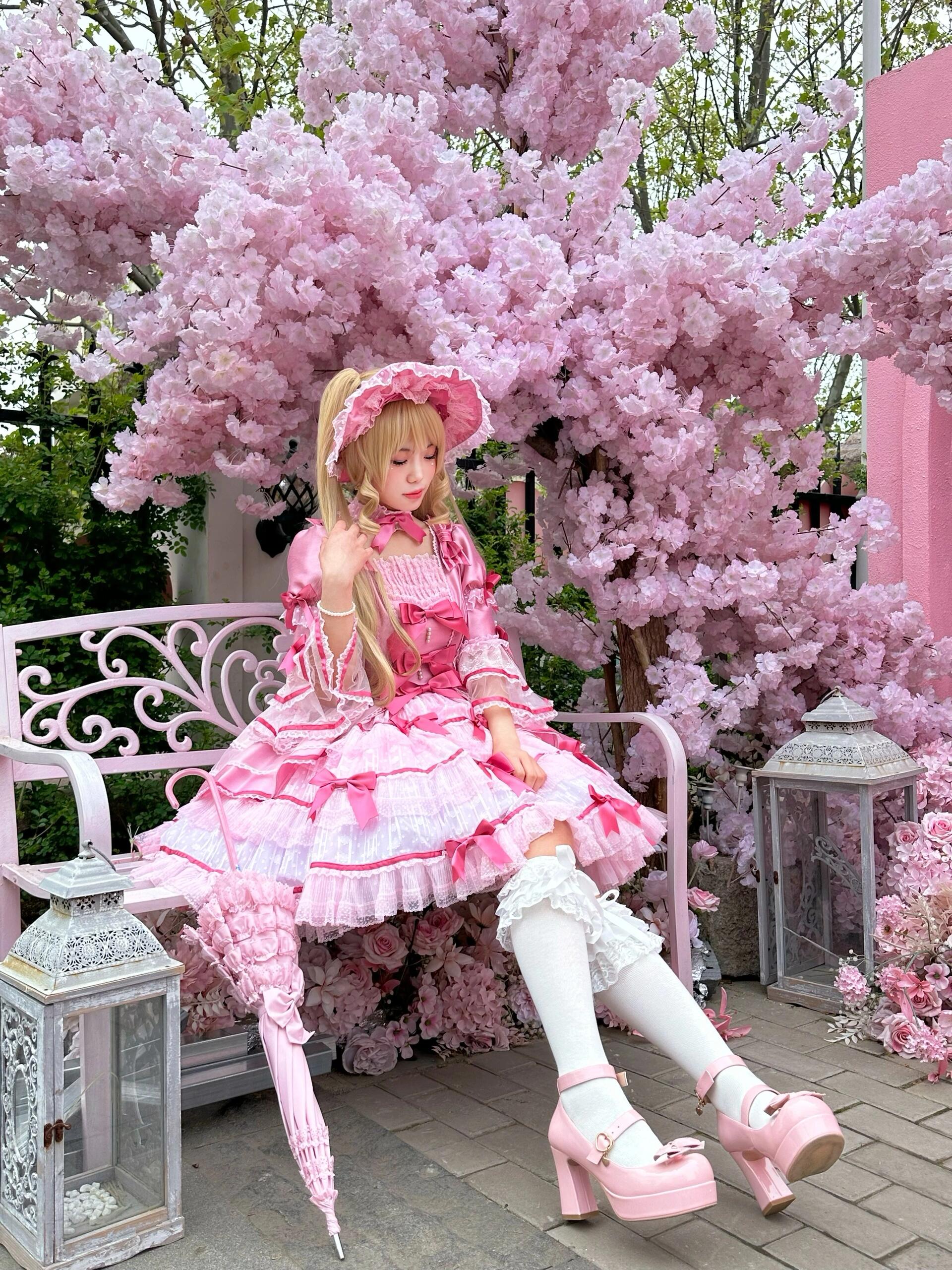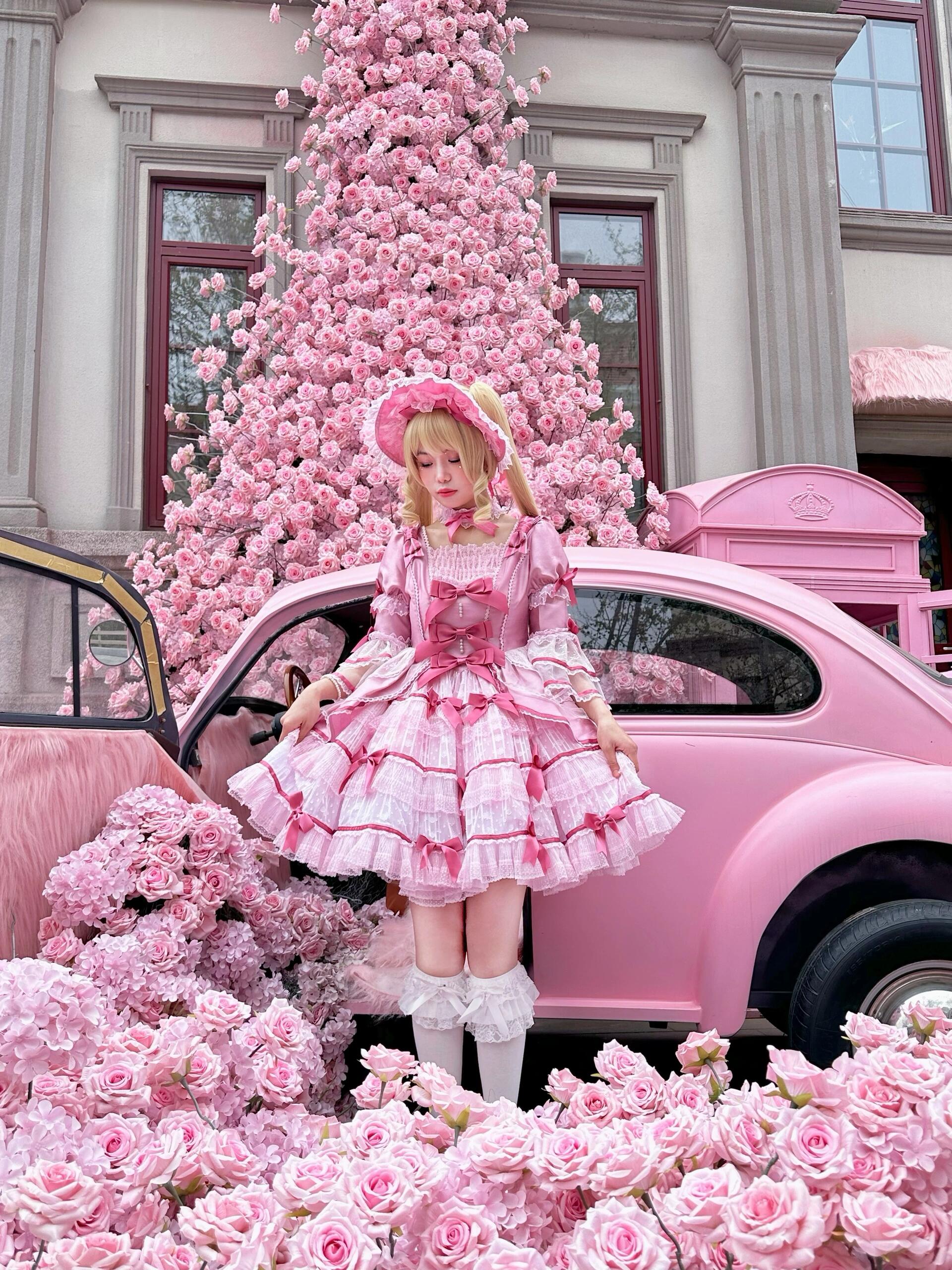 The pink, white, and fuchsia color palette contrasts beautifully, evoking a doll-like charm