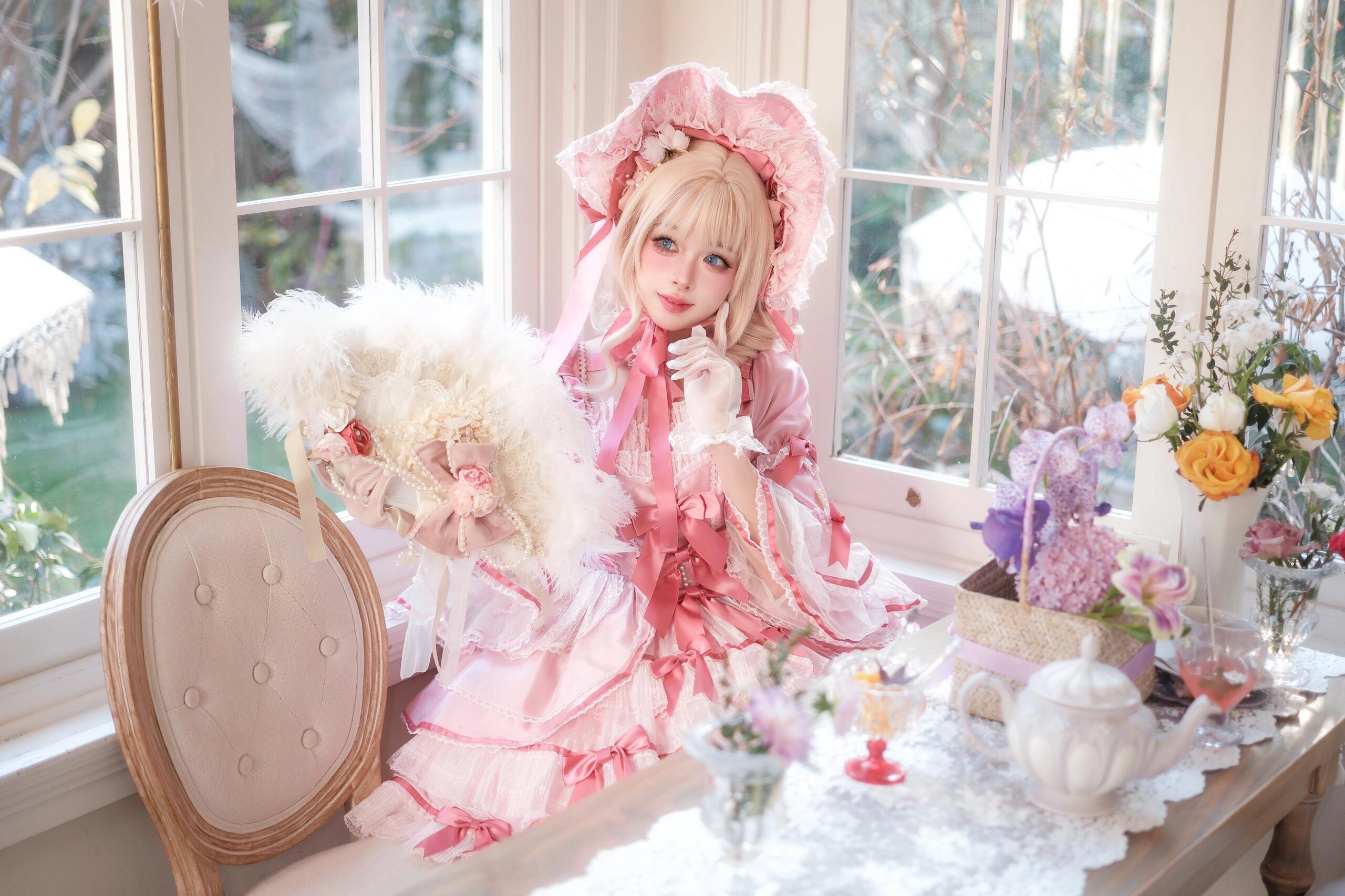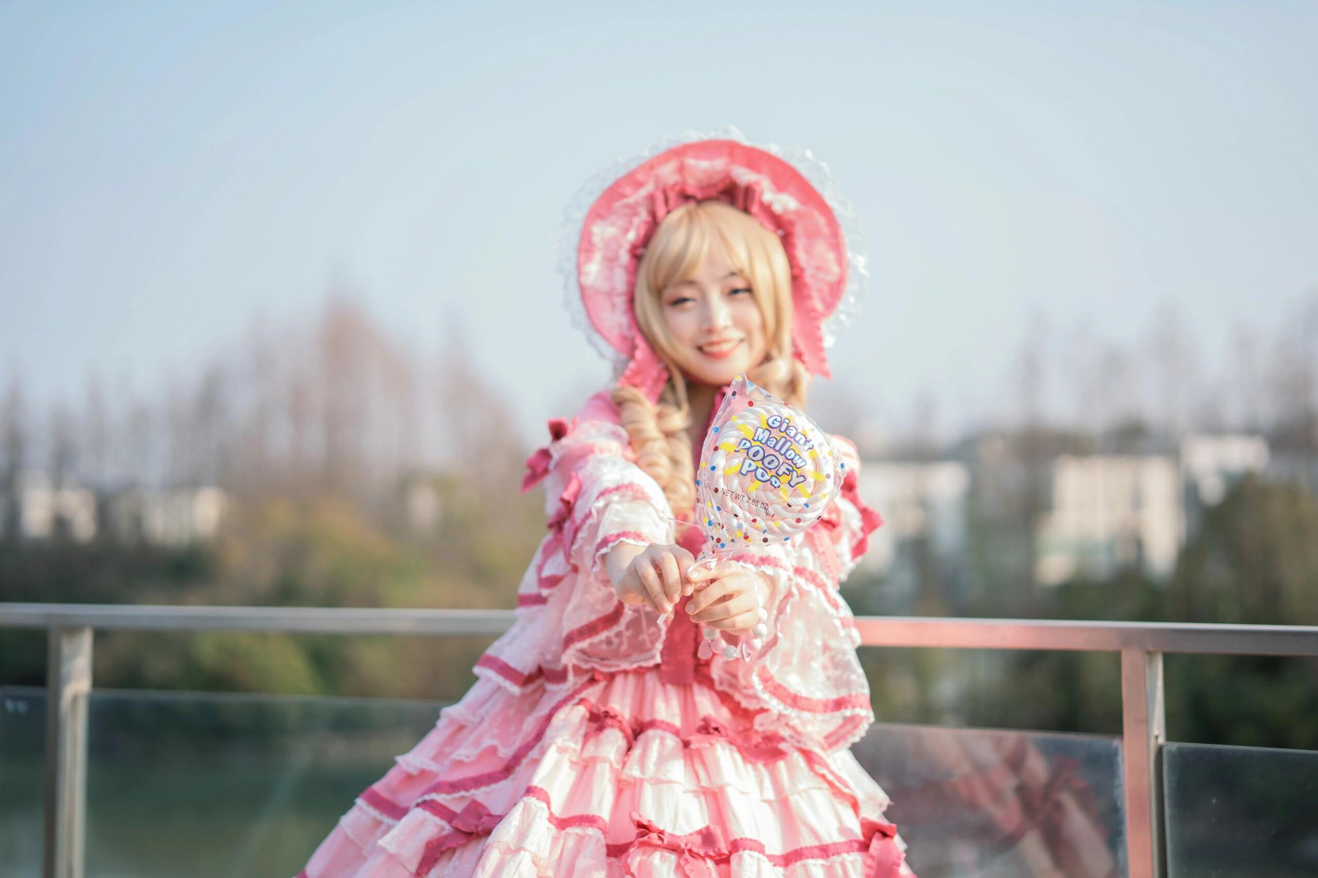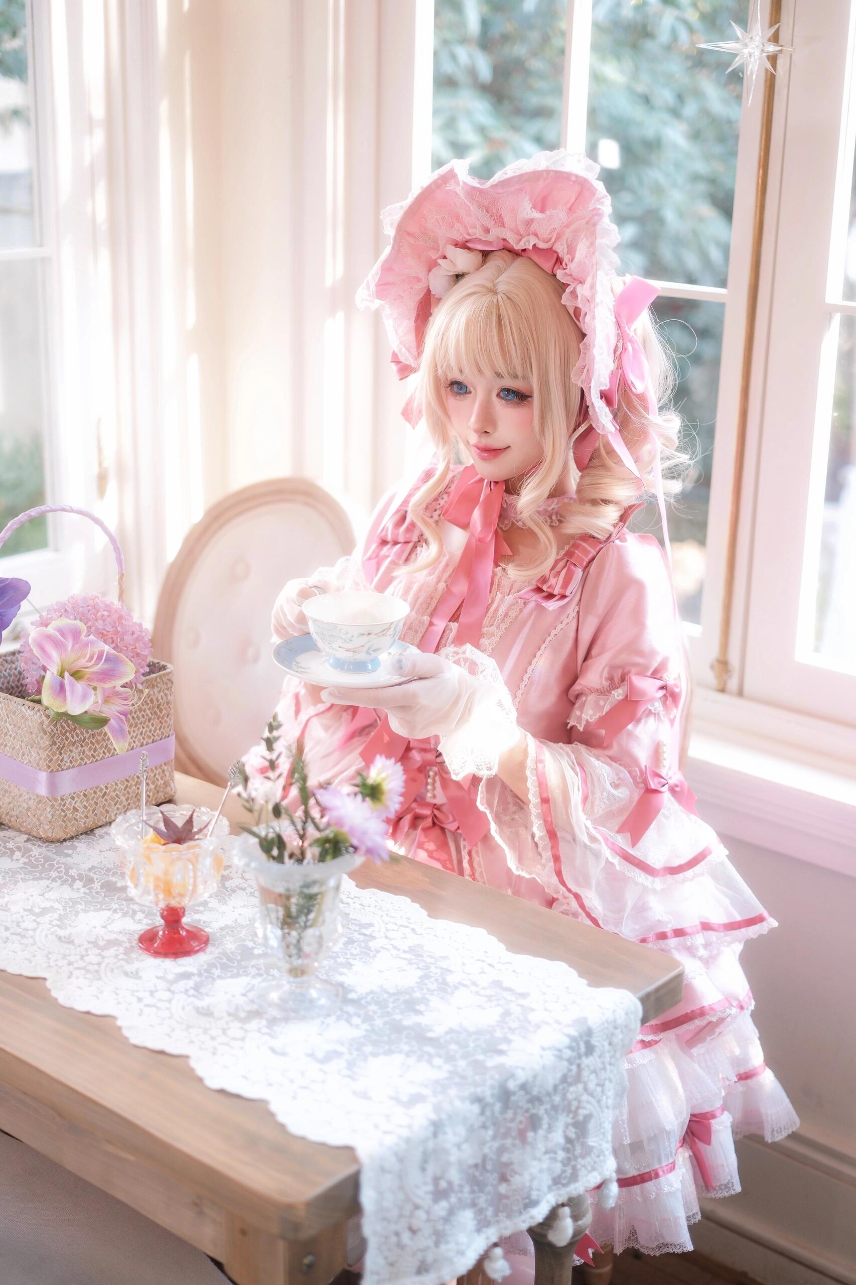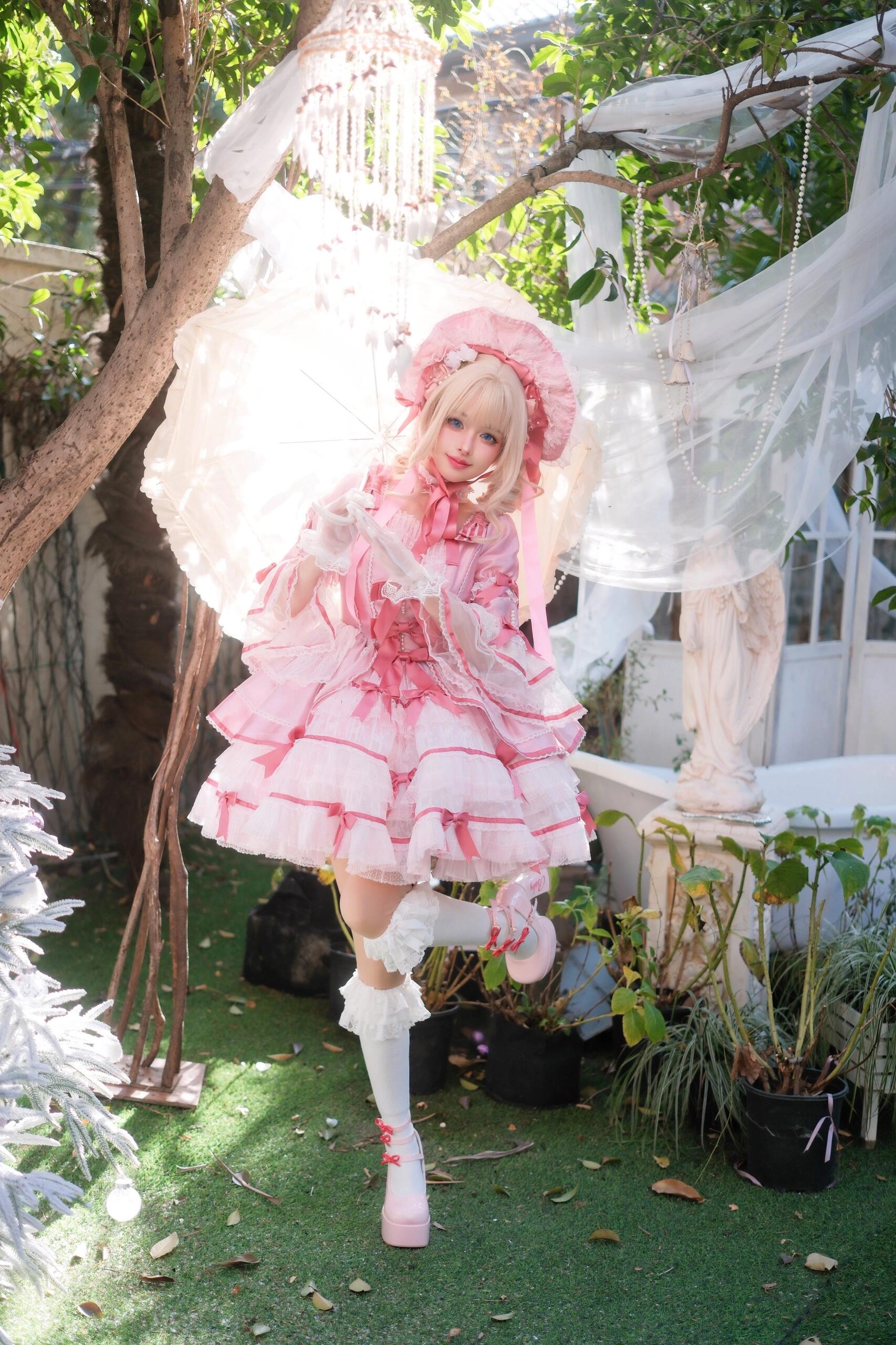 The pink, white, and fuchsia color palette contrasts beautifully, evoking a doll-like charm