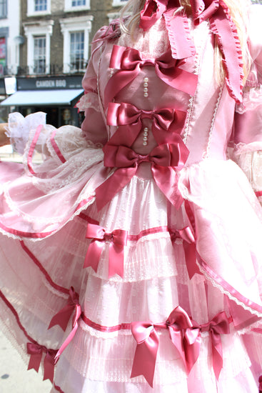 - Delicate lace detailing and contrasting bows, adding texture and depth throughout the dress.