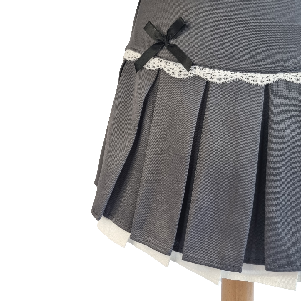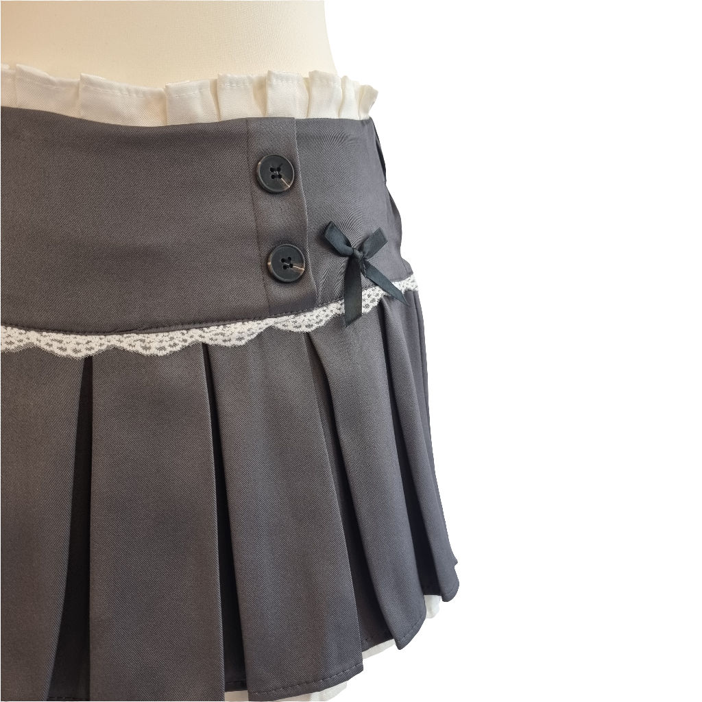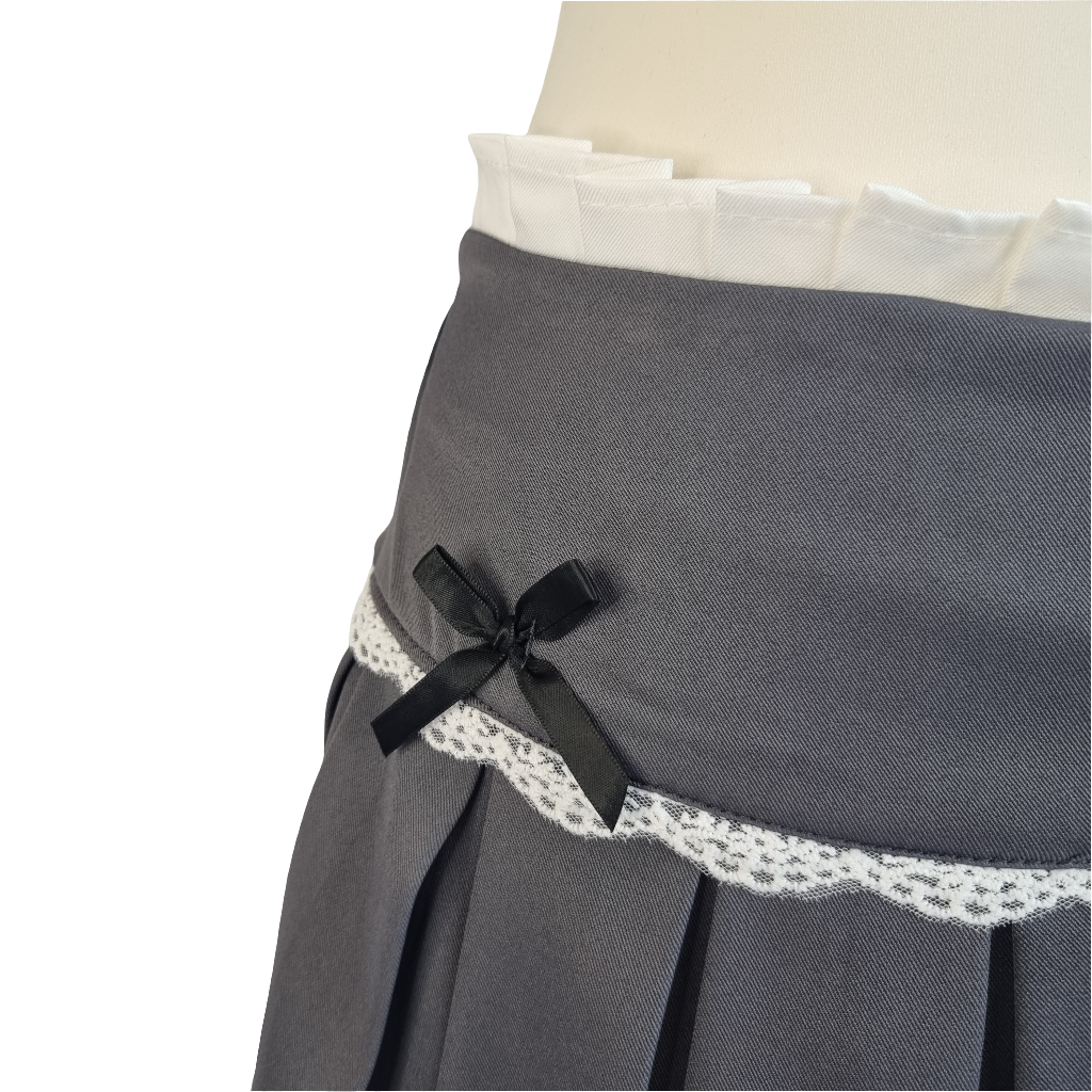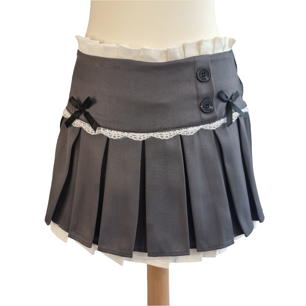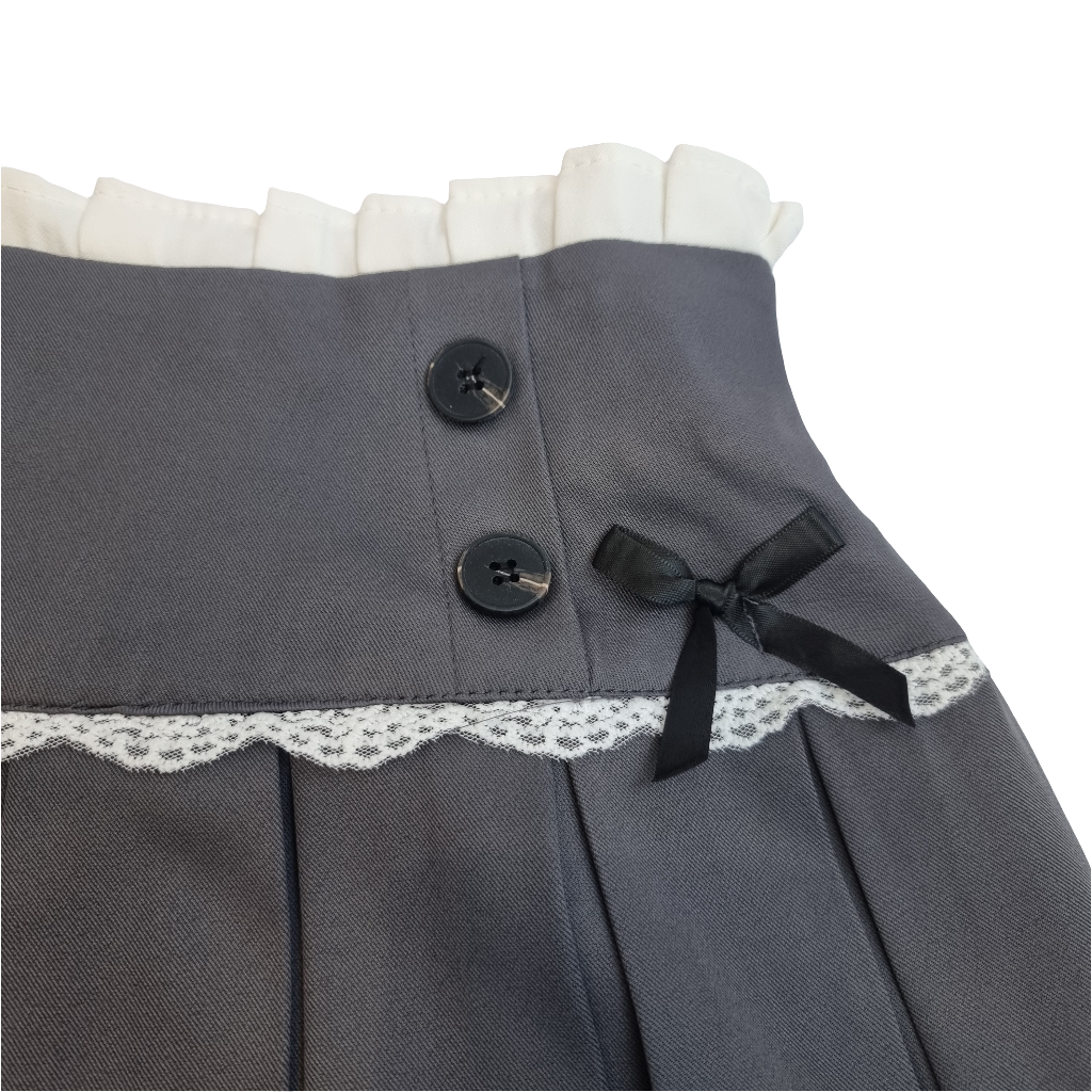 This striking short skirt features a blend of elegance and Lolita charm. The dark grey pleats contrast beautifully with the delicate white lace trim, while the black ribbon bows add a touch of femininity. The high-waisted design is complemented by a duo of black buttons, enhancing the structured silhouette. The skirt's layered effect, with a white underskirt peeking out from beneath the grey, adds depth and dimension to the overall look. Perfect for pairing with a blouse or corset top, this skirt is ideal for those who appreciate a mix of dark romance and playful style.