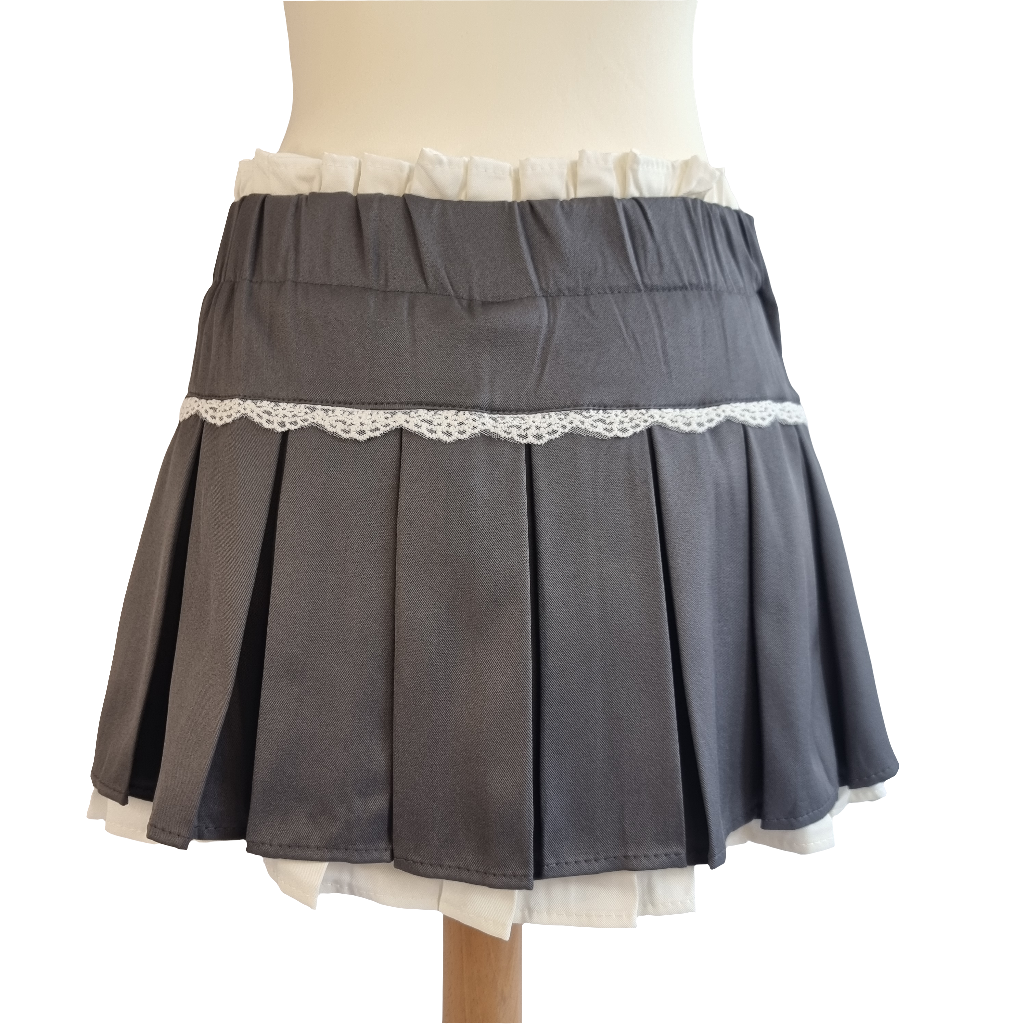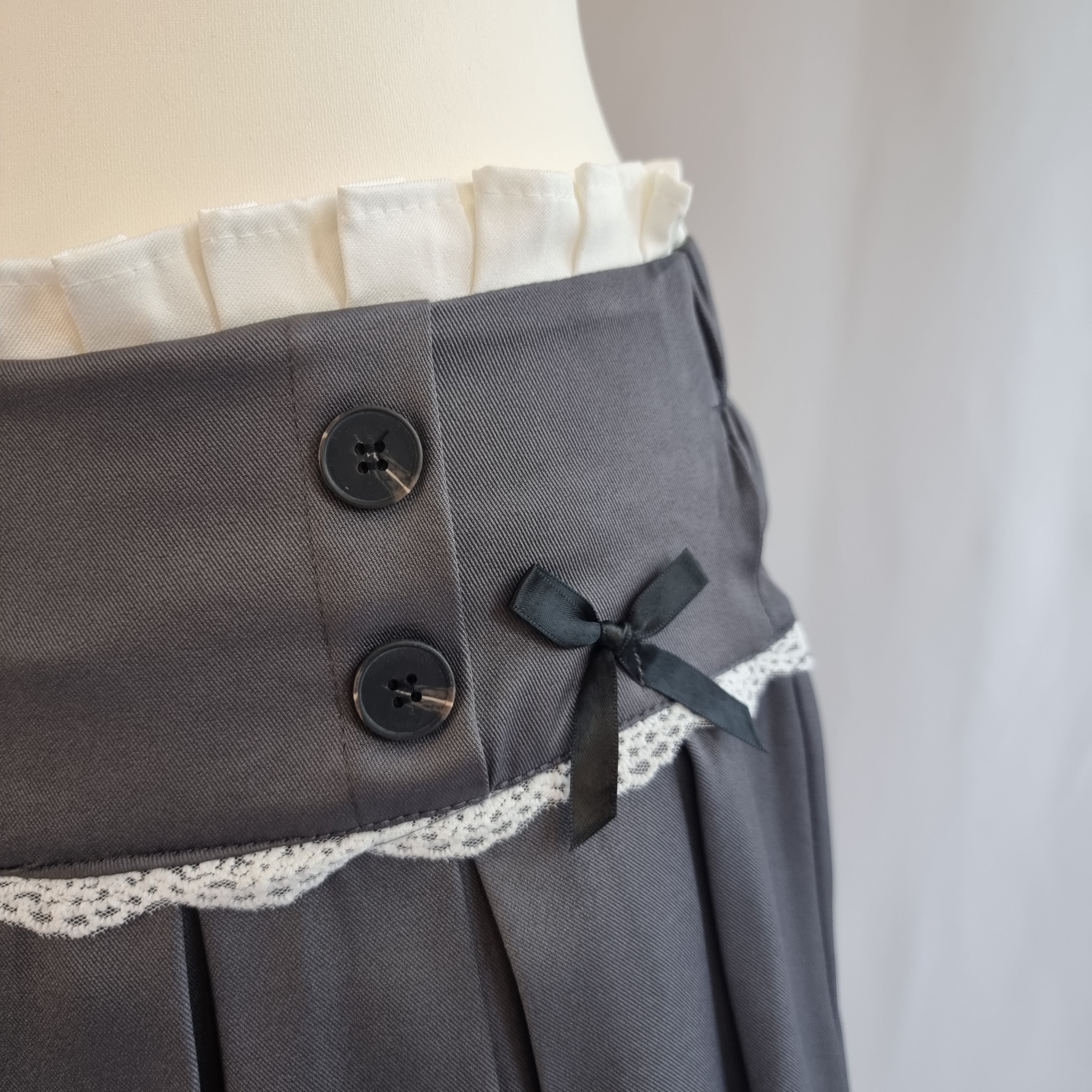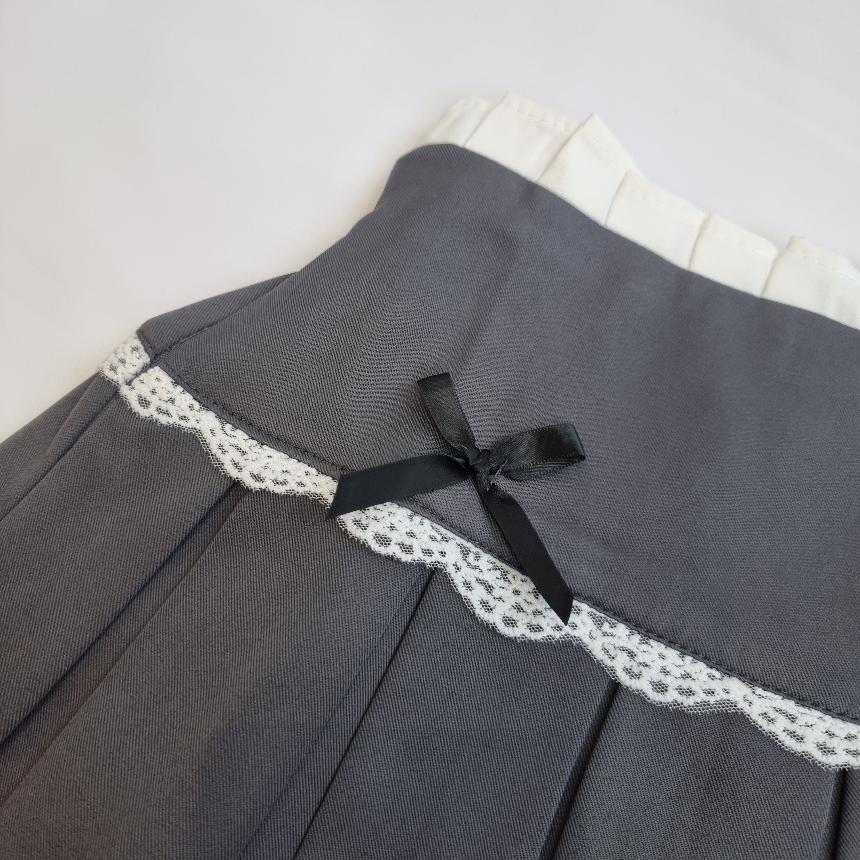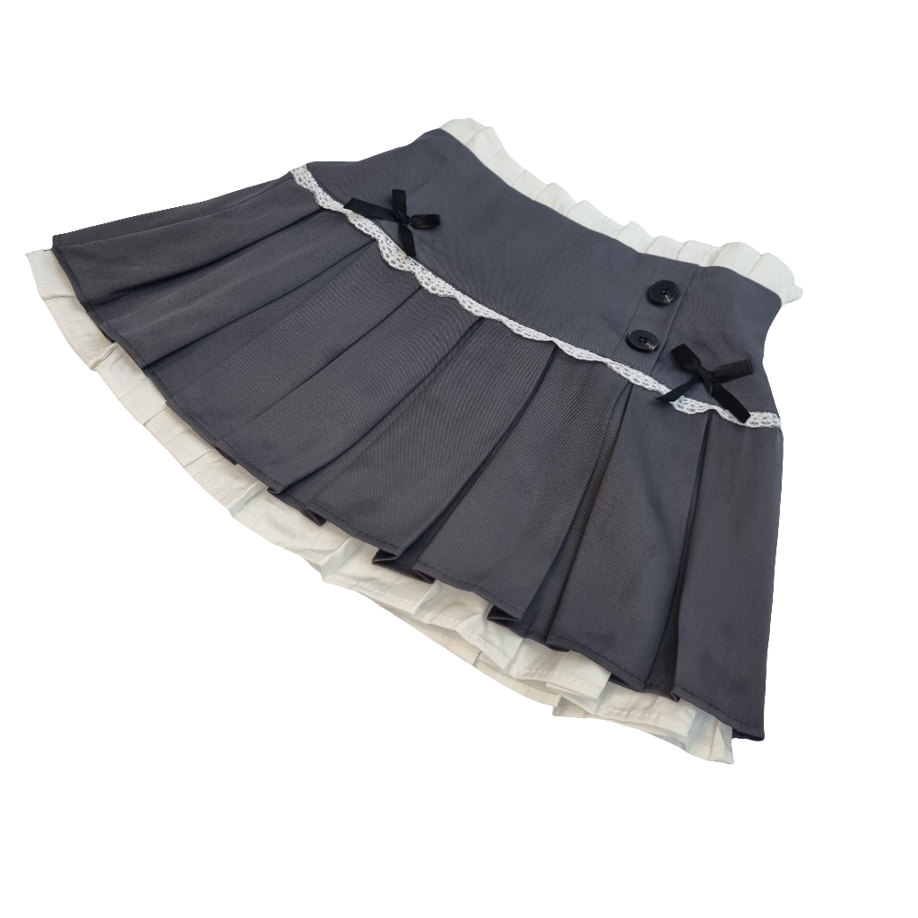 This striking short skirt features a blend of elegance and Lolita charm. The dark grey pleats contrast beautifully with the delicate white lace trim, while the black ribbon bows add a touch of femininity. The high-waisted design is complemented by a duo of black buttons, enhancing the structured silhouette. The skirt's layered effect, with a white underskirt peeking out from beneath the grey, adds depth and dimension to the overall look. Perfect for pairing with a blouse or corset top, this skirt is ideal for those who appreciate a mix of dark romance and playful style.