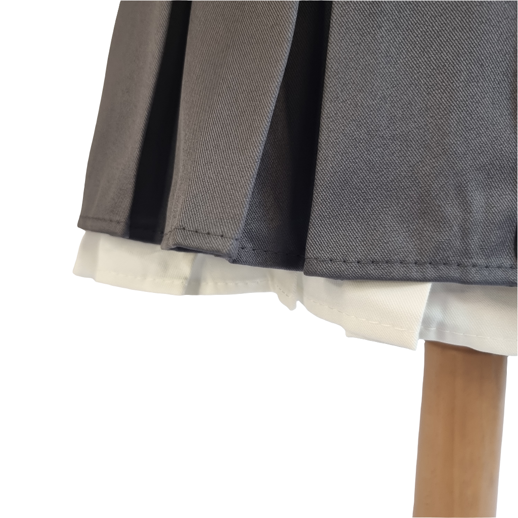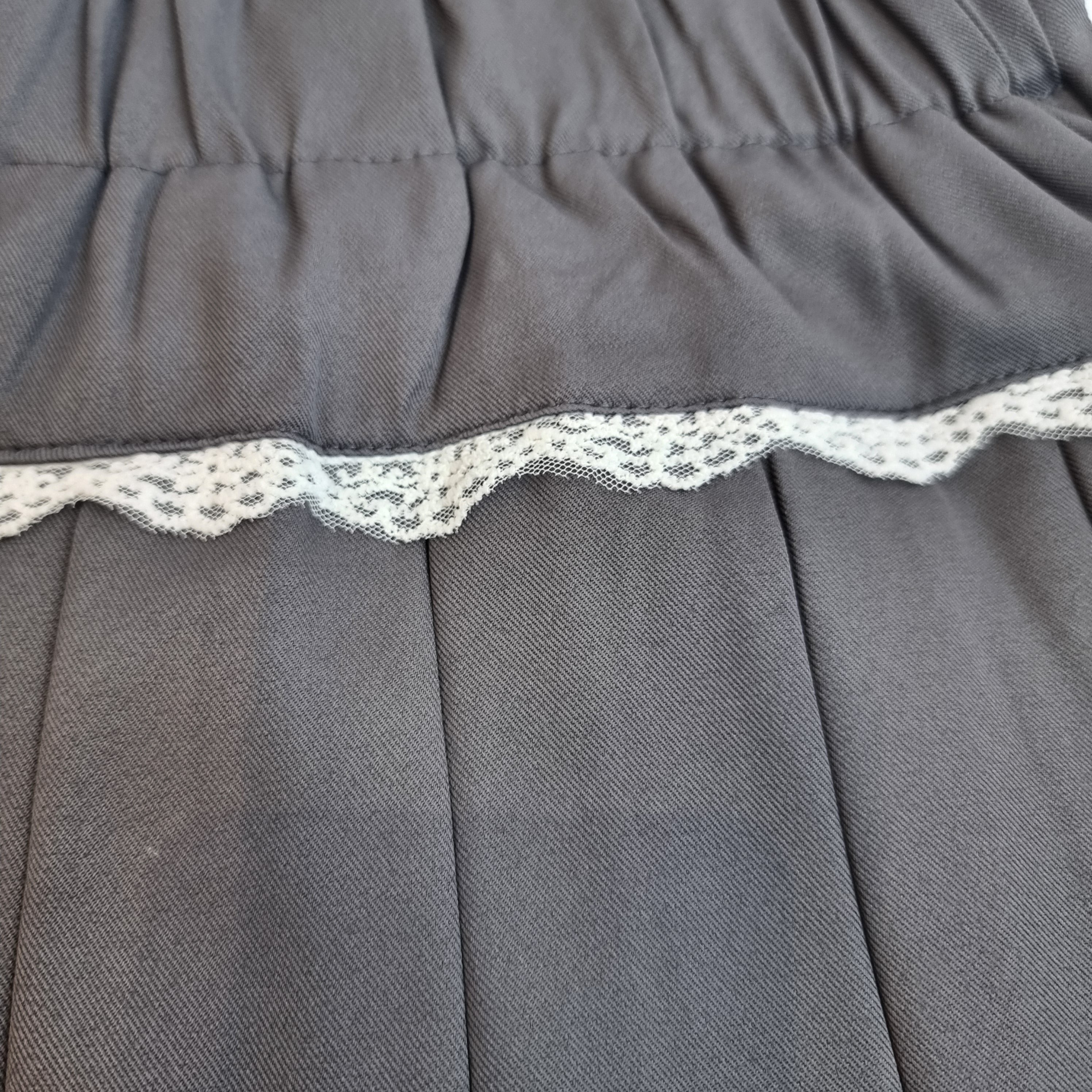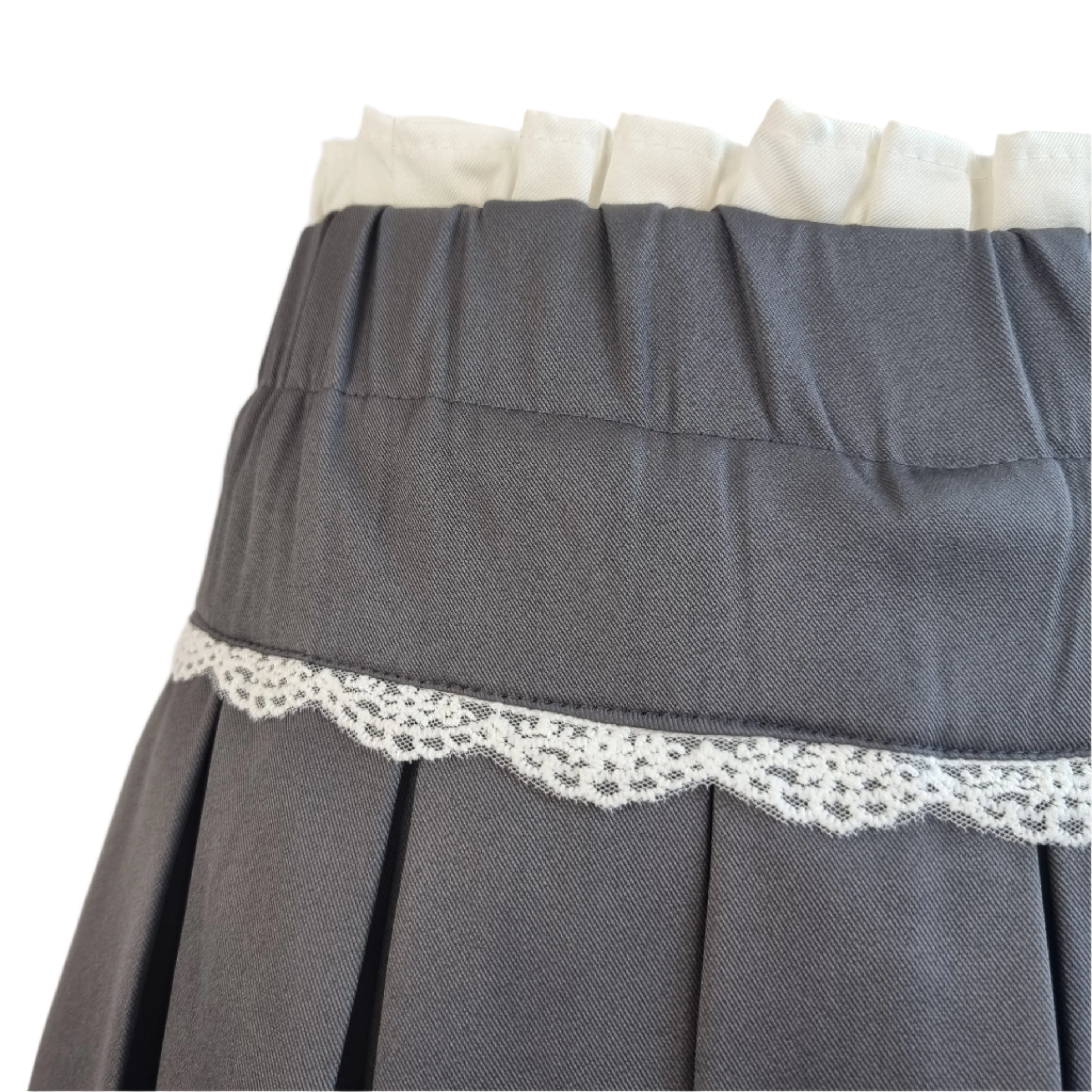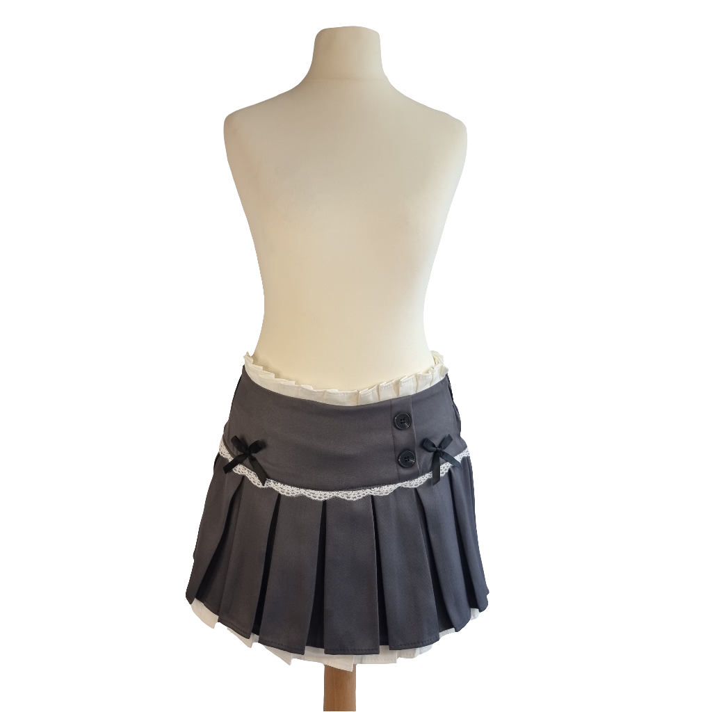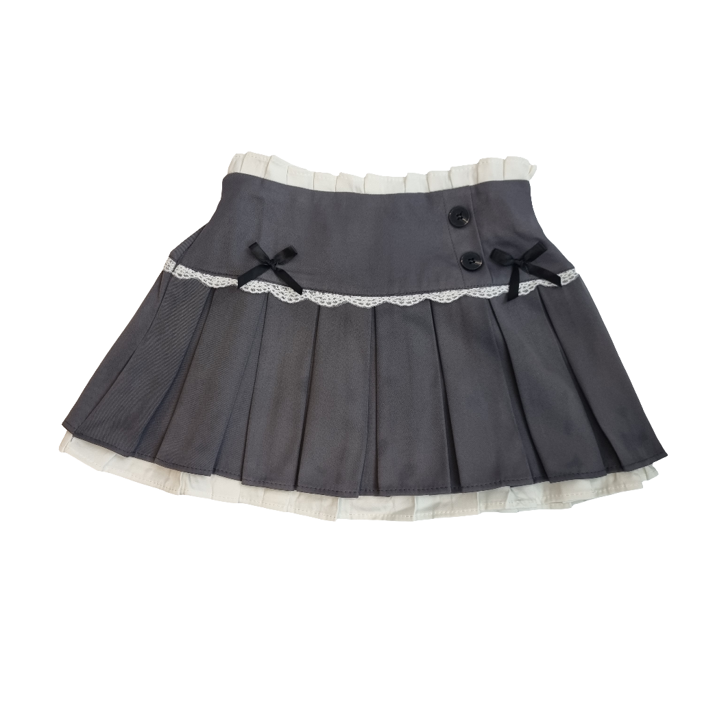 This striking short skirt features a blend of elegance and Lolita charm. The dark grey pleats contrast beautifully with the delicate white lace trim, while the black ribbon bows add a touch of femininity. The high-waisted design is complemented by a duo of black buttons, enhancing the structured silhouette. The skirt's layered effect, with a white underskirt peeking out from beneath the grey, adds depth and dimension to the overall look. Perfect for pairing with a blouse or corset top, this skirt is ideal for those who appreciate a mix of dark romance and playful style.