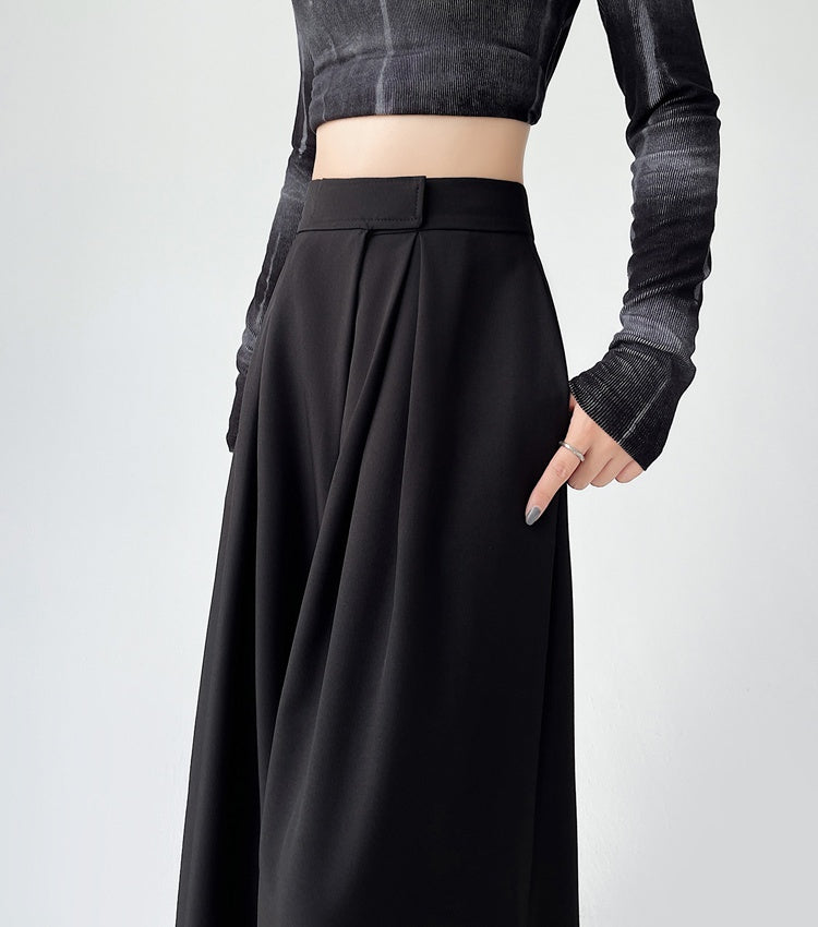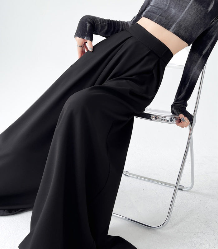 These high-waisted, black trousers feature a dramatic, wide-leg silhouette that flows beautifully with every step