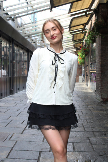 Sweet with a dash of sophistication, the Midnight Ribbon Ruffle Blouse is your ticket to instant charm. Crafted in soft cream fabric with delicate embroidered lace panels, it features fluttery ruffle accents along the button placket, dainty black buttons, and a romantic black ribbon tie at the neck for that perfect contrast. The gently puffed sleeves finish with frilled cuffs, adding a touch of vintage whimsy. Whether paired with a skirt for tea dates or tailored shorts for a chic day out, this blouse will have you looking effortlessly polished. Available in sizes S to XL for a dreamy fit that’s made to flatter. ✨