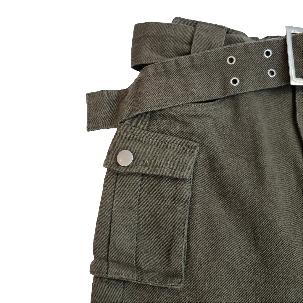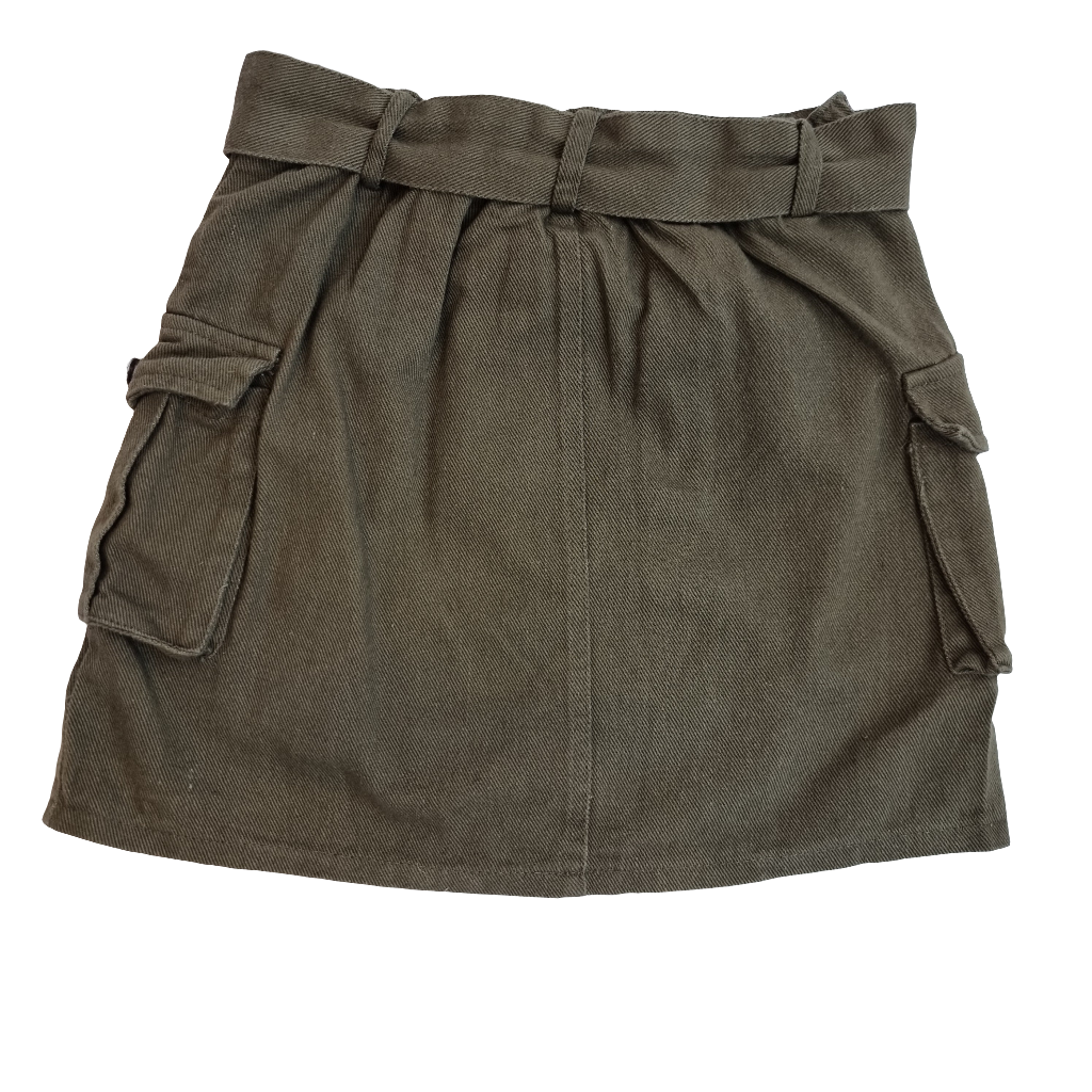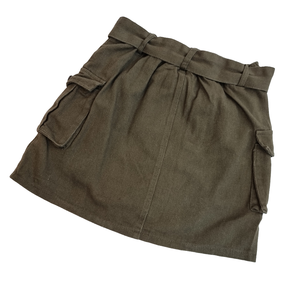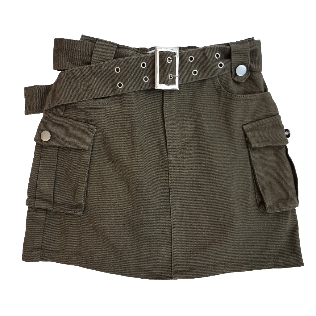 This olive green cargo skirt blends utilitarian design with modern fashion, making it a versatile addition to any wardrobe. Constructed from sturdy fabric, the skirt features functional cargo pockets on both sides, perfect for storing small essentials while on the go. The high-waisted style is complemented by a matching belt with eyelet details and a silver buckle, adding a rugged yet stylish element. The skirt’s straight-cut silhouette and earthy green tone make it ideal for casual outings or weekend adventures. Pair it with a simple top or a cropped jacket to complete a look that’s both practical and trendy.