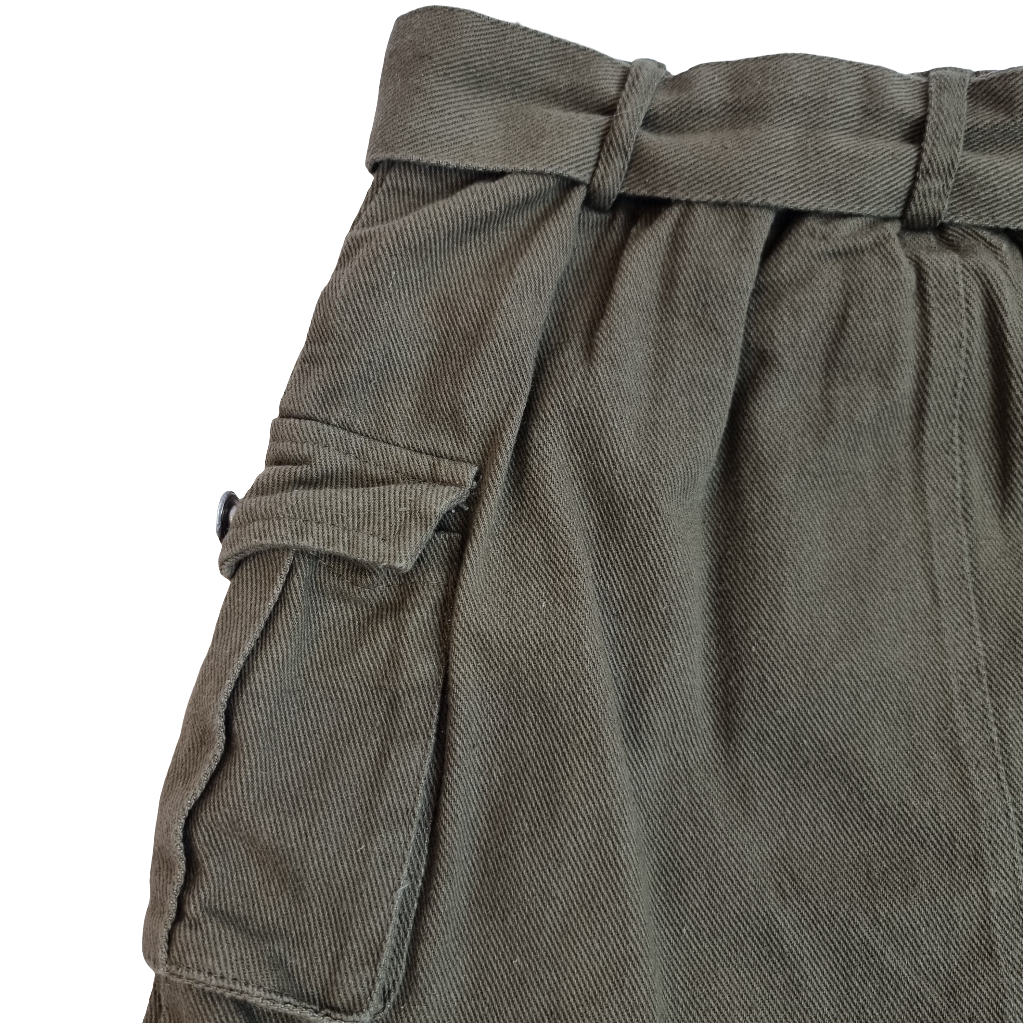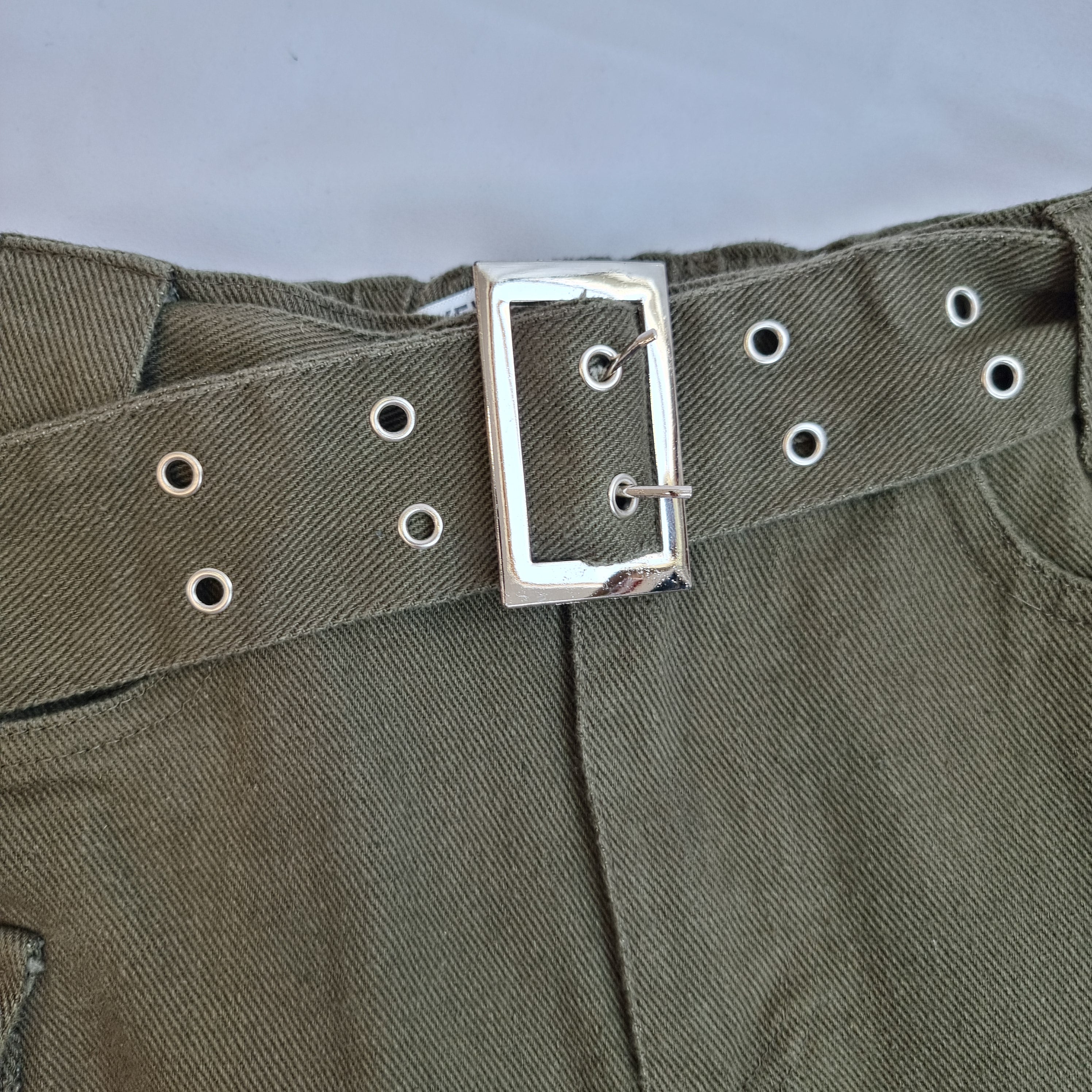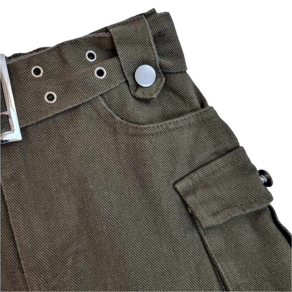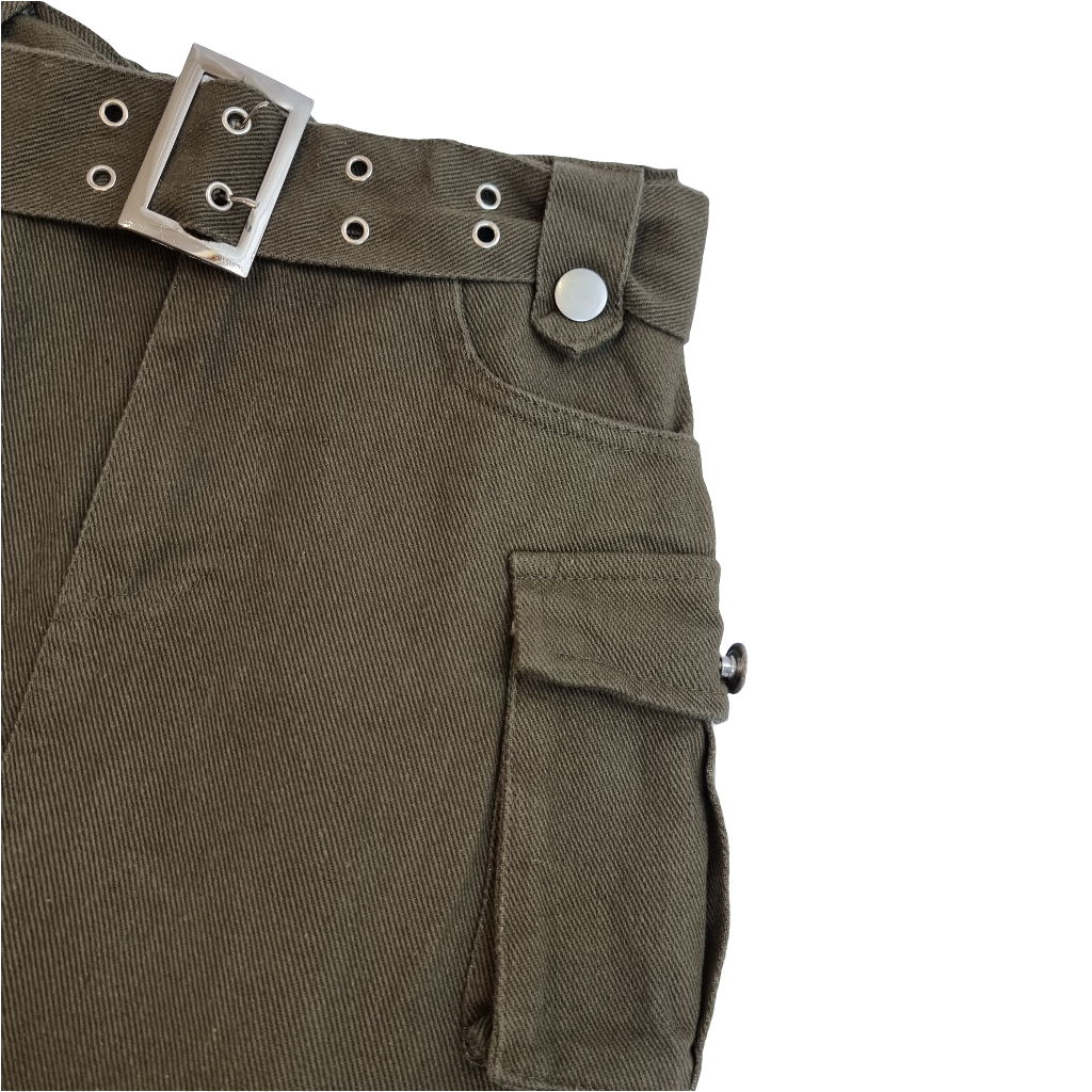 This olive green cargo skirt blends utilitarian design with modern fashion, making it a versatile addition to any wardrobe. Constructed from sturdy fabric, the skirt features functional cargo pockets on both sides, perfect for storing small essentials while on the go. The high-waisted style is complemented by a matching belt with eyelet details and a silver buckle, adding a rugged yet stylish element. The skirt’s straight-cut silhouette and earthy green tone make it ideal for casual outings or weekend adventures. Pair it with a simple top or a cropped jacket to complete a look that’s both practical and trendy.
