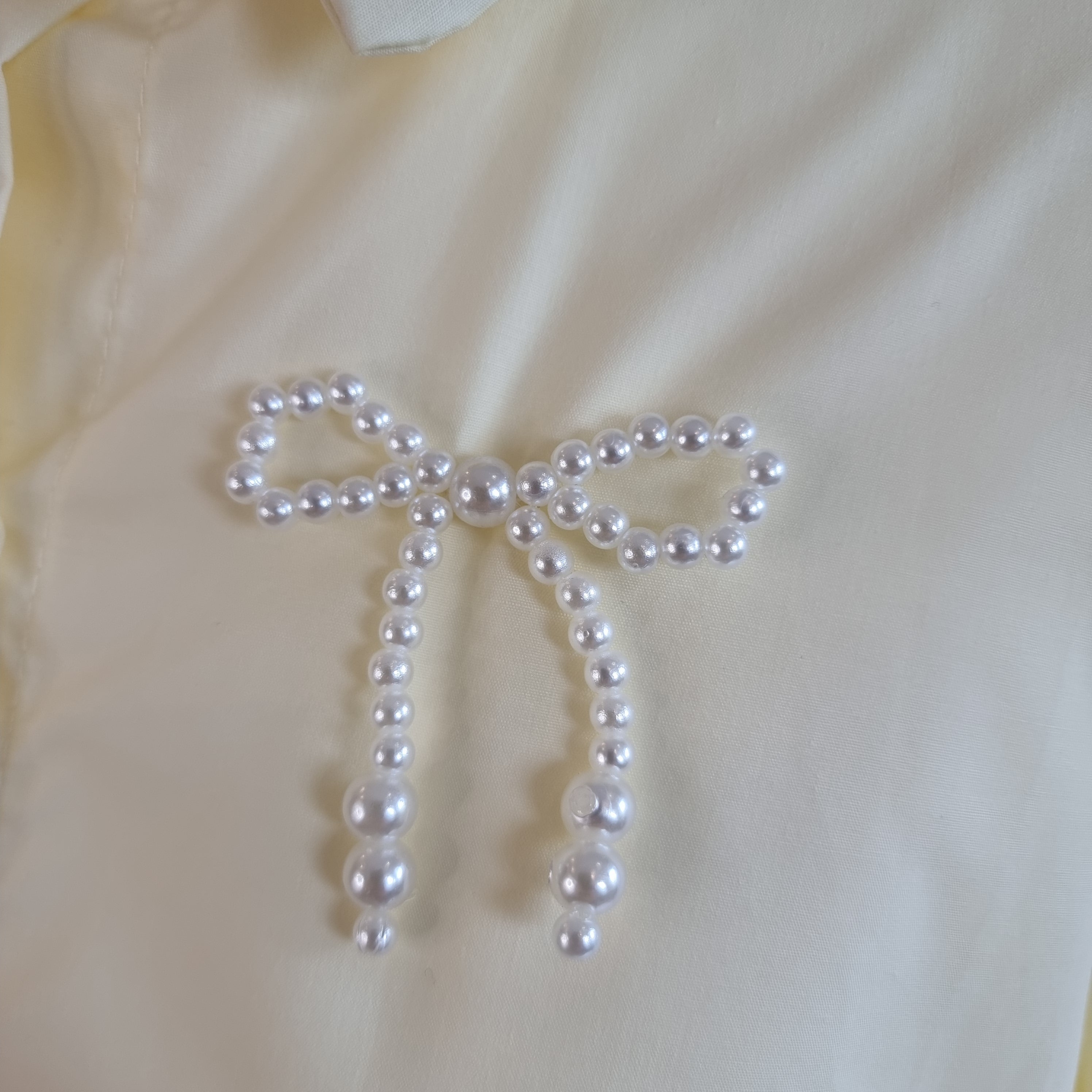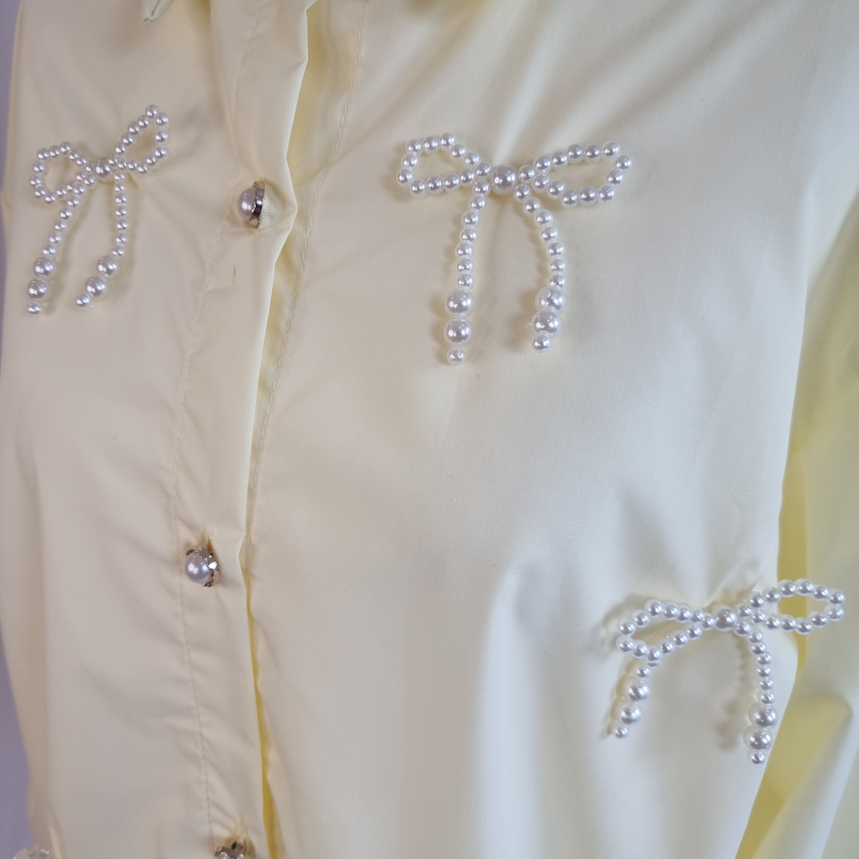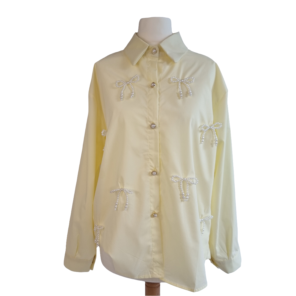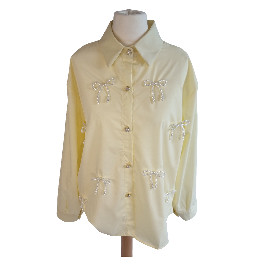 Elevate your wardrobe with the Pearl Bow Charm Blouse, a delicate and sophisticated statement piece. Crafted from a soft, pastel yellow fabric, this blouse features intricate pearl bead bows embroidered throughout, adding a touch of elegance and charm to your look. The loose-fit design offers comfort while maintaining a polished silhouette, and the pearl buttons complete the refined aesthetic. Perfect for a chic daytime look or an evening out, this blouse is versatile and timeless, making it a must-have for any fashion-forward wardrobe.
