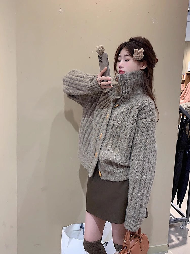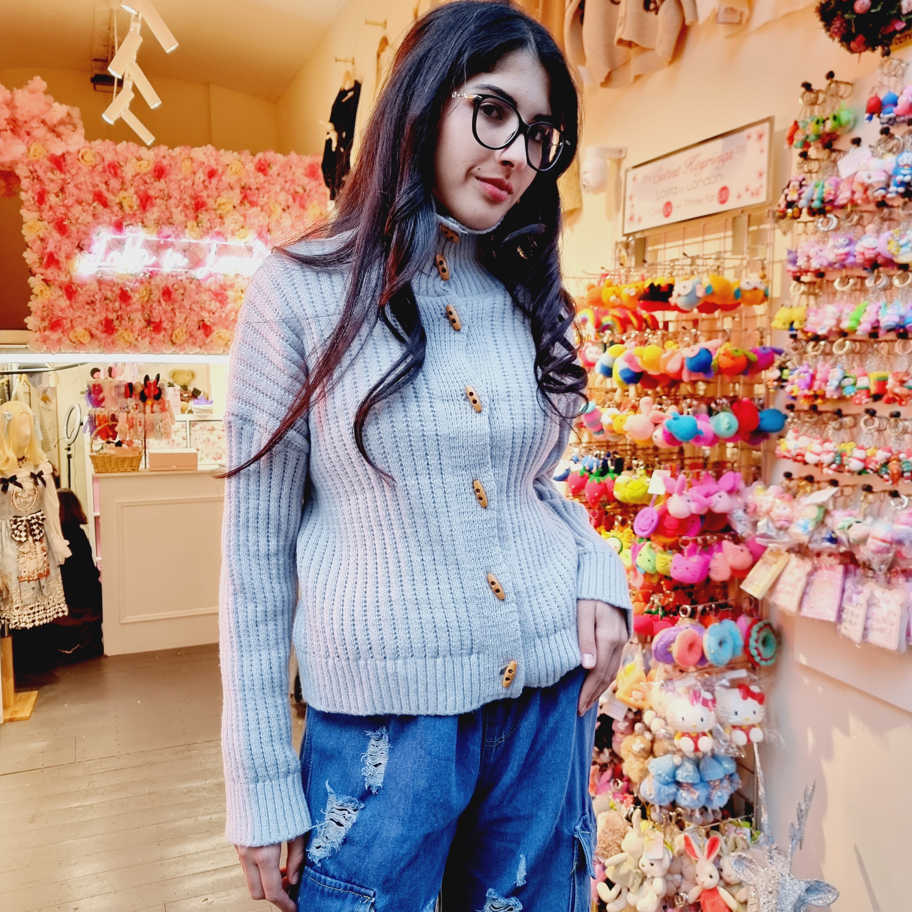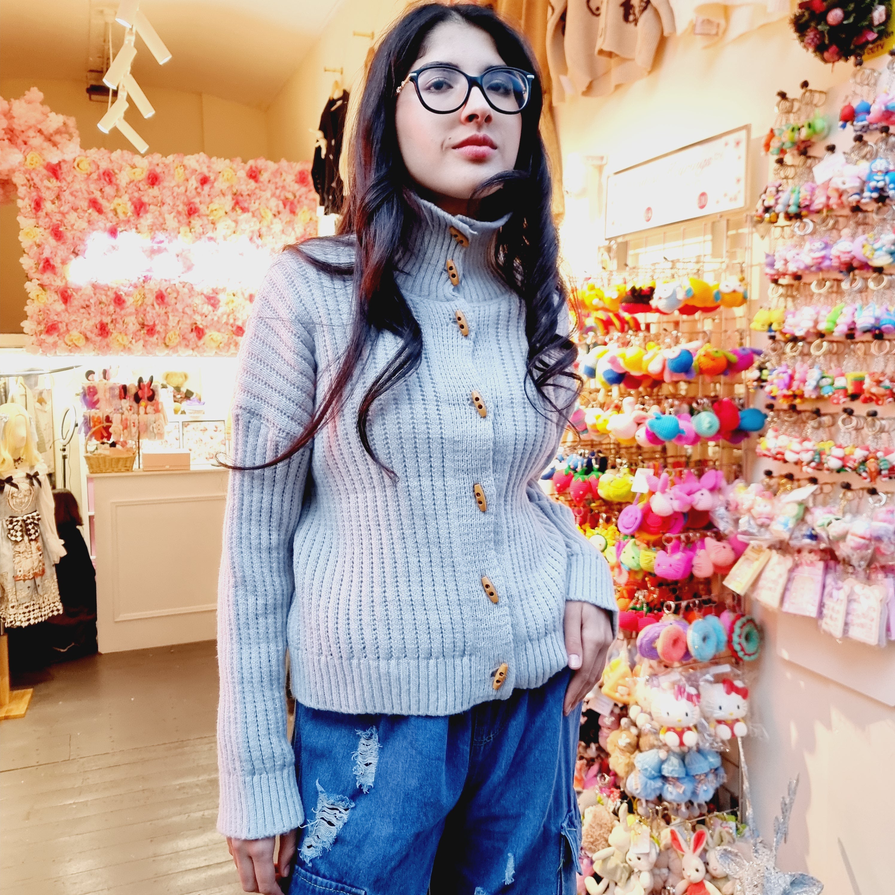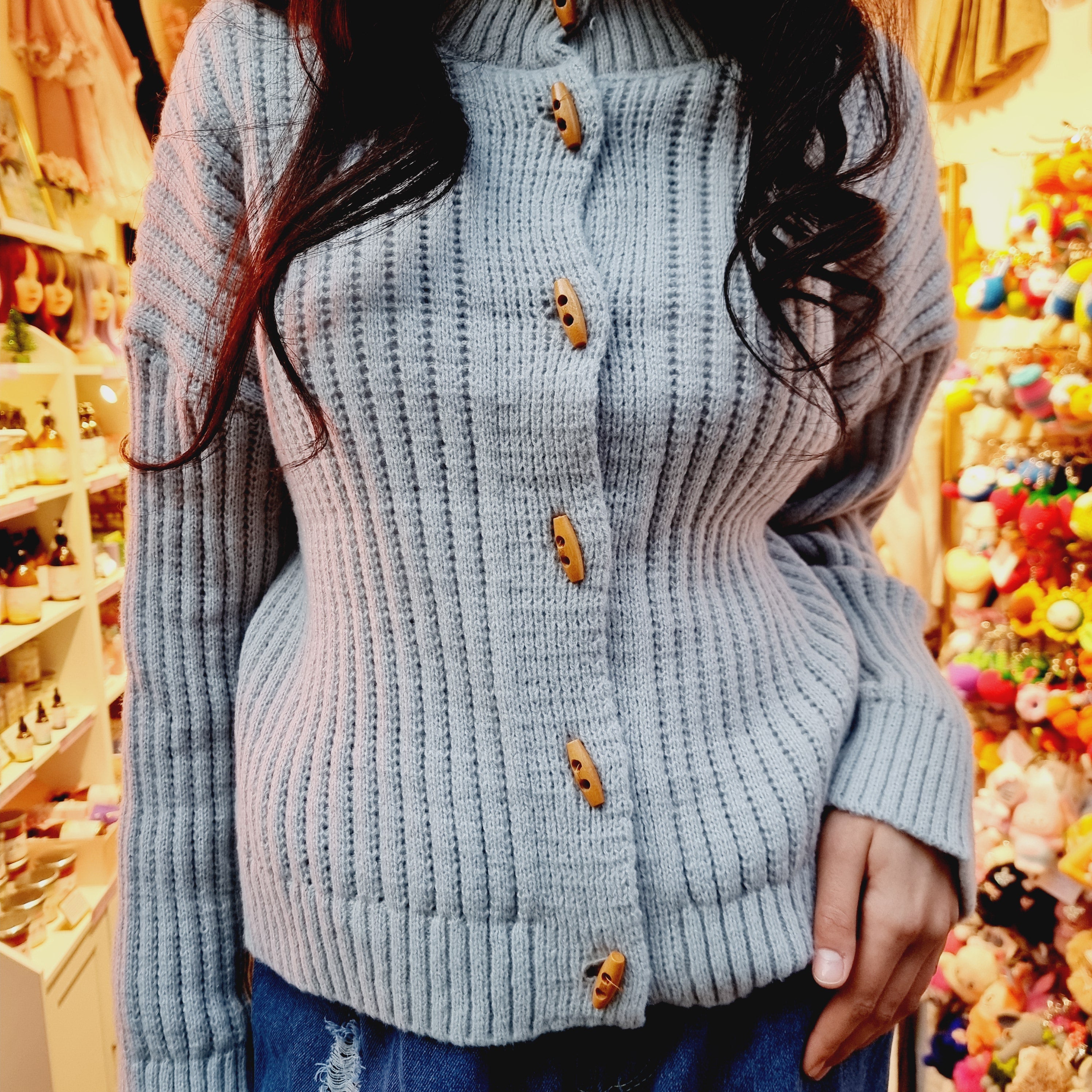 Snuggle up in ultimate comfort with our Cozy Ribbed Horn-Buckle Knitted Sweater. Designed for both warmth and style, this thick, oversized sweater features a unique ribbed pattern and a distinctive horn-buckle closure, adding a rustic touch to your outfit. The high, fold-over collar keeps you extra cozy, while the relaxed fit ensures ease of movement and a laid-back vibe. Perfect for chilly days or casual outings, it can be effortlessly paired with jeans, skirts, or wide-leg trousers for a fashionable layered look. The earthy khaki and grey tones and soft, textured knit make this sweater a wardrobe essential for fall and winter.