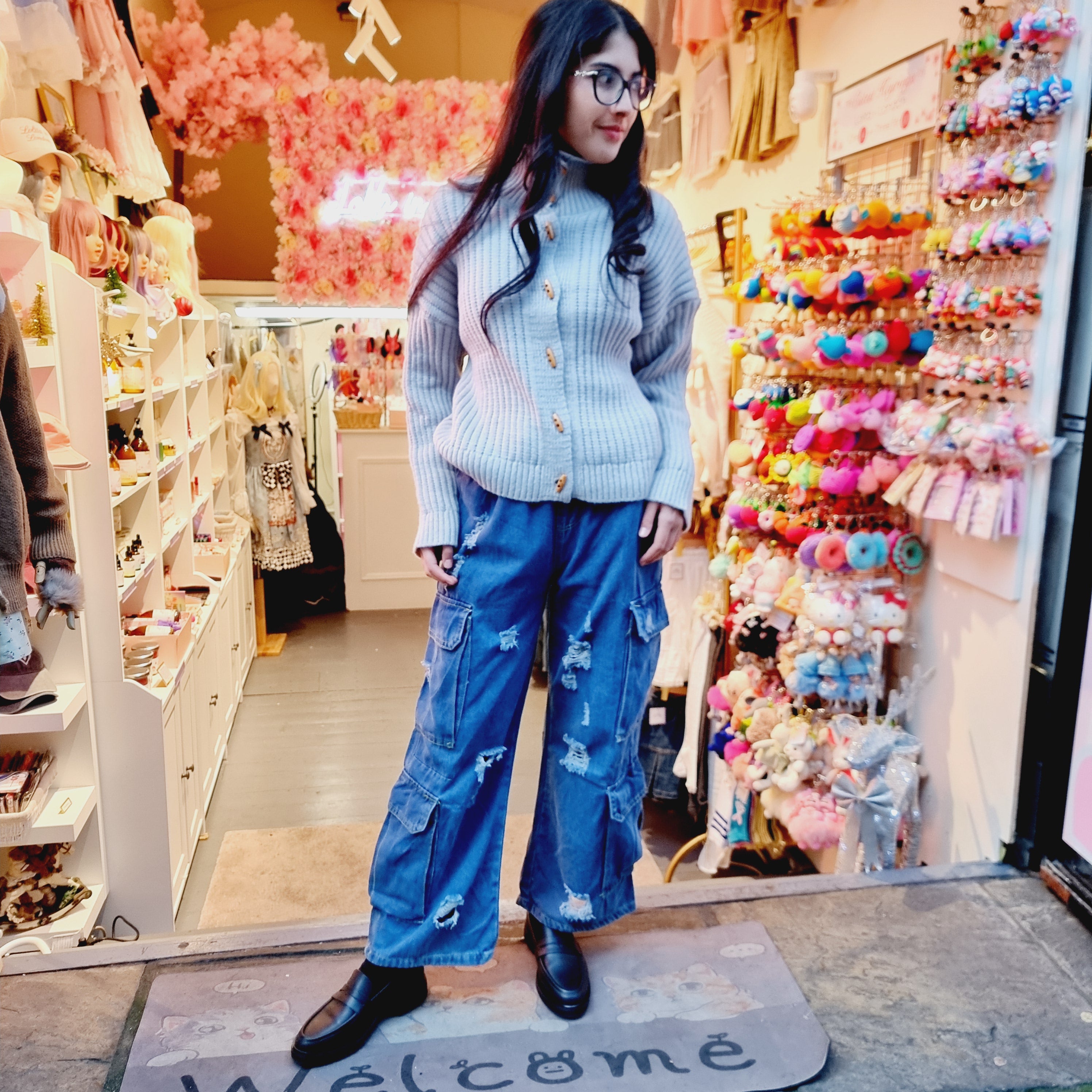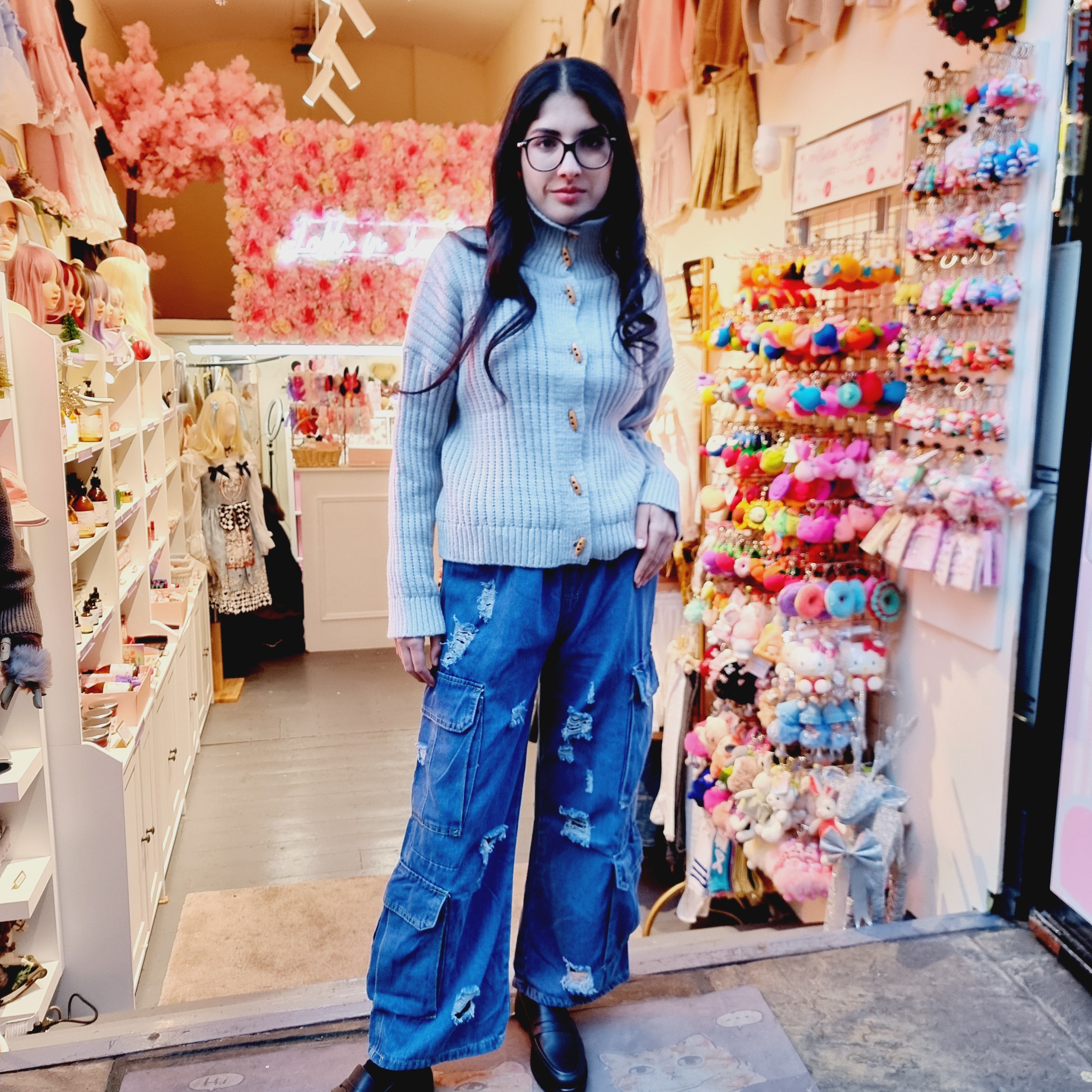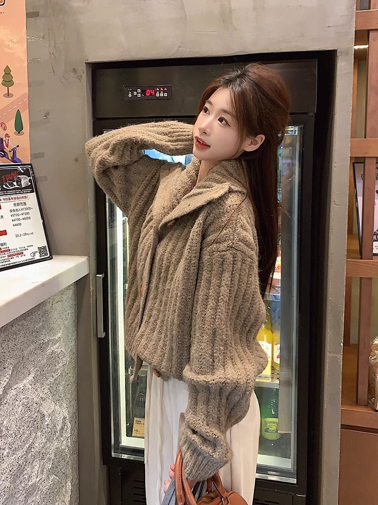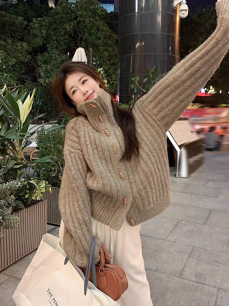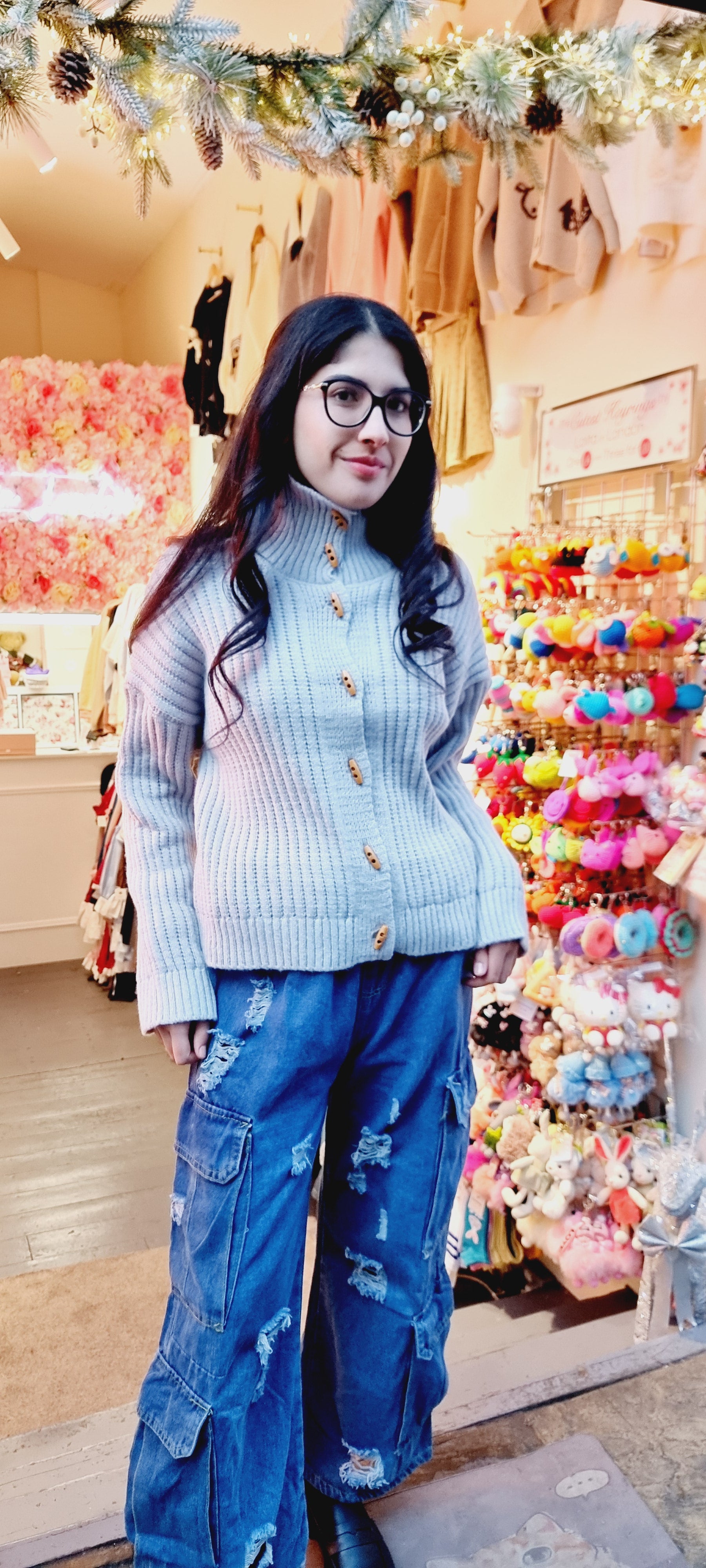 Snuggle up in ultimate comfort with our Cozy Ribbed Horn-Buckle Knitted Sweater. Designed for both warmth and style, this thick, oversized sweater features a unique ribbed pattern and a distinctive horn-buckle closure, adding a rustic touch to your outfit. The high, fold-over collar keeps you extra cozy, while the relaxed fit ensures ease of movement and a laid-back vibe. Perfect for chilly days or casual outings, it can be effortlessly paired with jeans, skirts, or wide-leg trousers for a fashionable layered look. The earthy khaki and grey tones and soft, textured knit make this sweater a wardrobe essential for fall and winter.