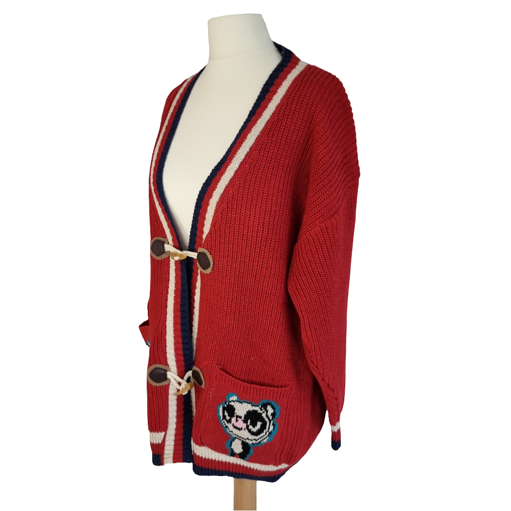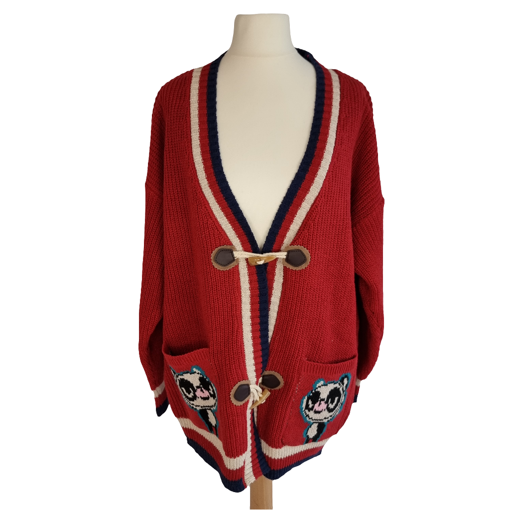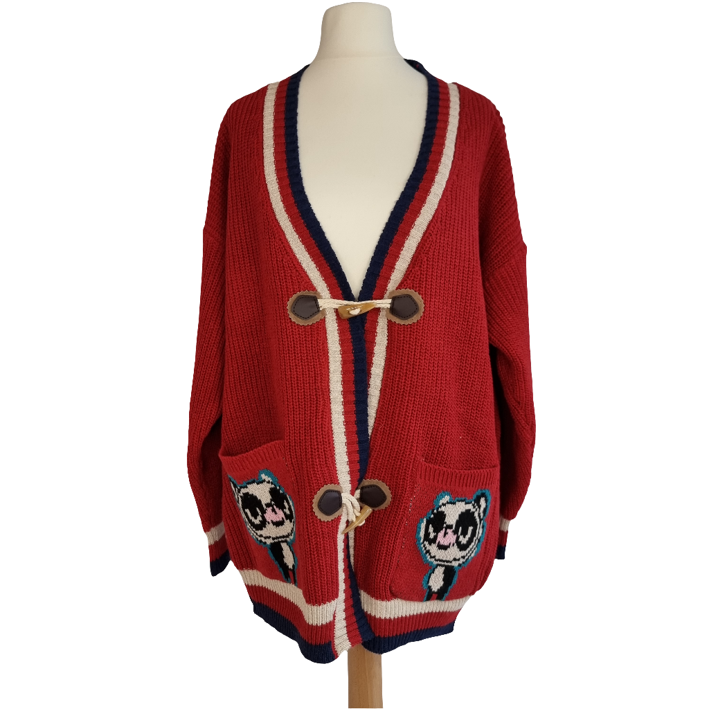 Add a touch of playful charm to your wardrobe with our Whimsical Panda Knit Cardigan. This cozy cardigan in vibrant red features an adorable panda face on each pocket, making it a statement piece that combines comfort with fun style. The toggle button closure adds a unique touch, complemented by navy and cream striped accents along the neckline and cuffs. Perfect for layering, this cardigan pairs effortlessly with jeans or a skirt for a quirky yet chic look. Embrace your fun side and keep warm with this one-of-a-kind knit!