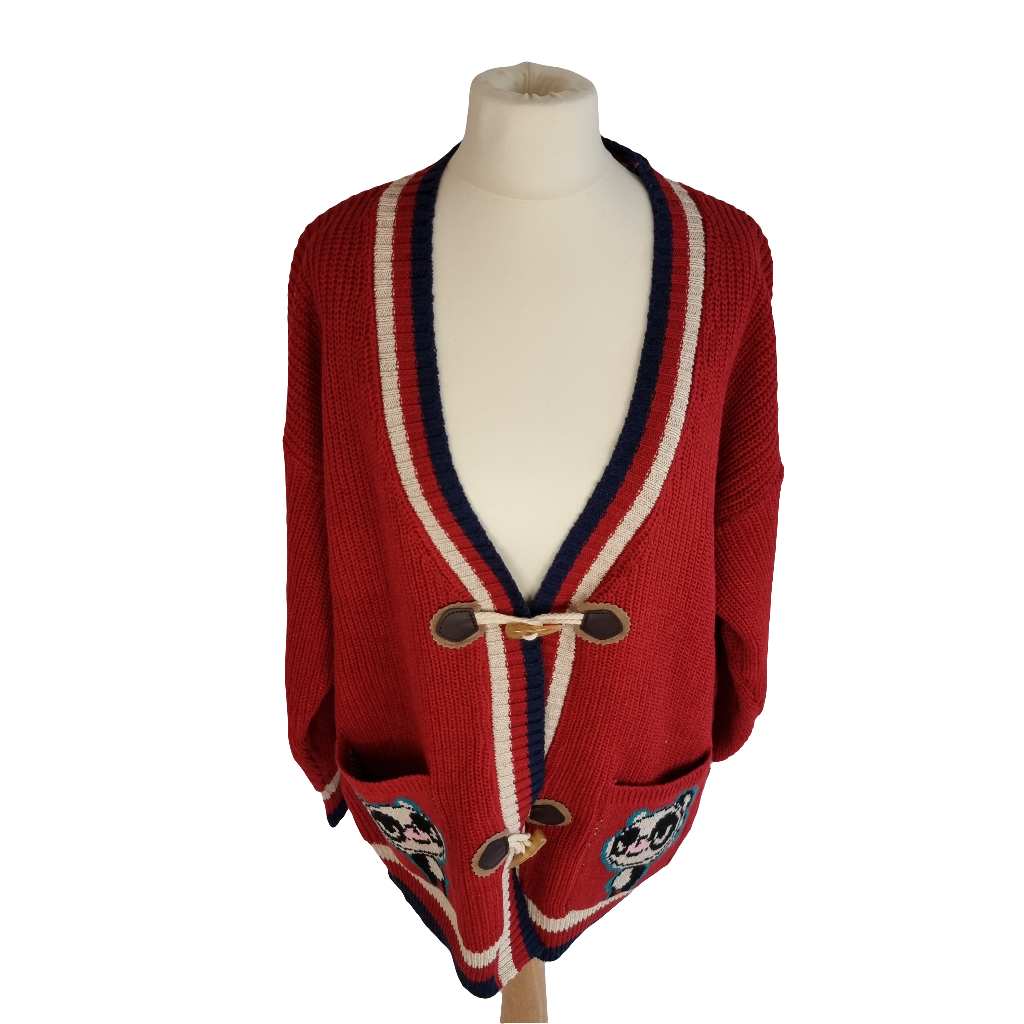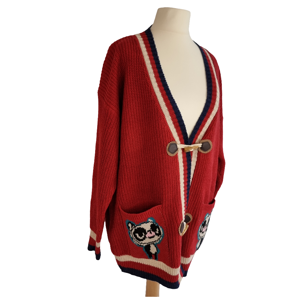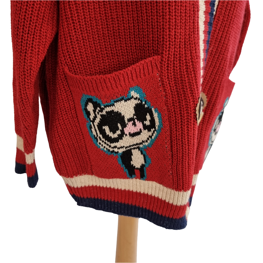 Add a touch of playful charm to your wardrobe with our Whimsical Panda Knit Cardigan. This cozy cardigan in vibrant red features an adorable panda face on each pocket, making it a statement piece that combines comfort with fun style. The toggle button closure adds a unique touch, complemented by navy and cream striped accents along the neckline and cuffs. Perfect for layering, this cardigan pairs effortlessly with jeans or a skirt for a quirky yet chic look. Embrace your fun side and keep warm with this one-of-a-kind knit!