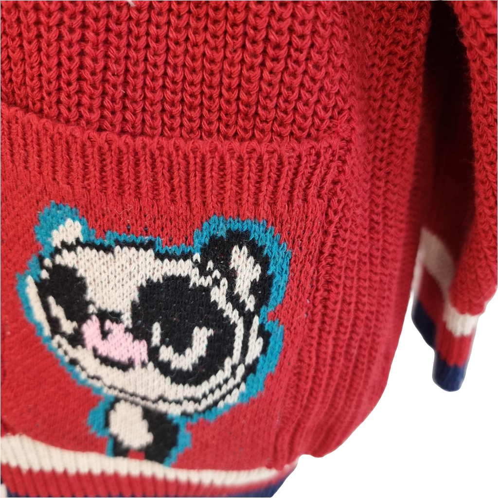 This cozy cardigan in vibrant red features an adorable panda face on each pocket
