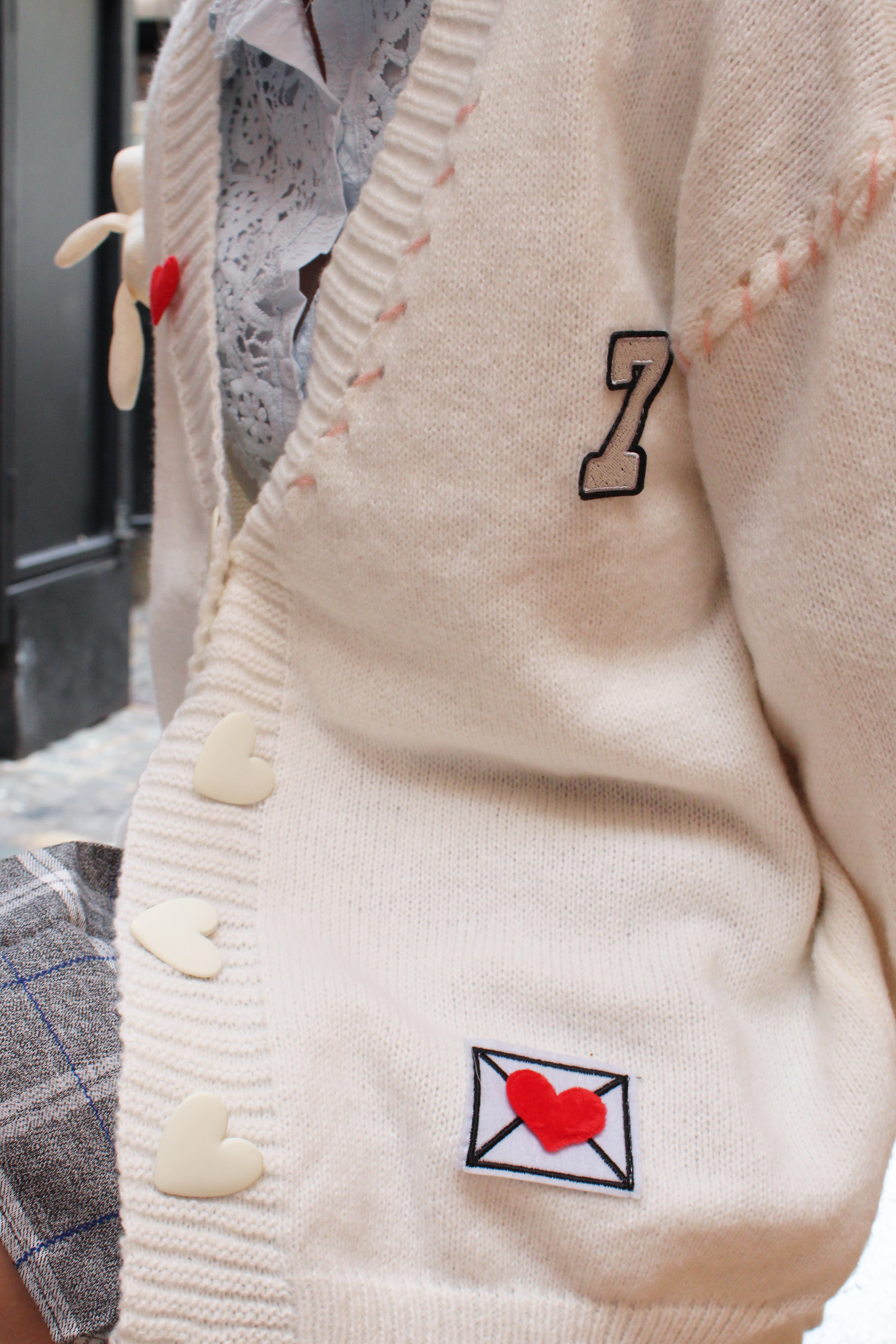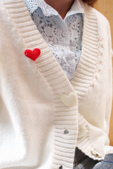 Add a sprinkle of cuteness to your outfit with the Sweetheart Bunny Companion Cardigan. This soft, cream-colored cardigan is adorned with charming heart buttons, a delicate red heart patch, and a unique embroidered envelope detail, capturing a playful yet romantic vibe. A tiny bunny toy peeks out from the chest, giving this cardigan an extra dose of whimsy. The pastel stitching along the seams enhances its cozy feel, while the relaxed fit and front pockets make it as functional as it is adorable. Perfect for casual outings or cozy nights in, this cardigan is a must-have for those who love to wear their heart on their sleeve.