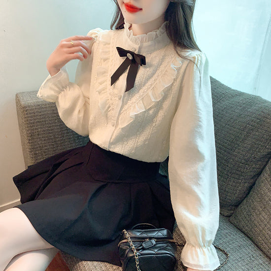 A striking black ribbon bow with a jeweled center completes the look—perfect for pairing with skirts, jumperskirts, or high-waisted silhouettes. Whether dressed for tea parties, dates, or polished daily wear, this blouse elevates every outfit with refined sophistication.